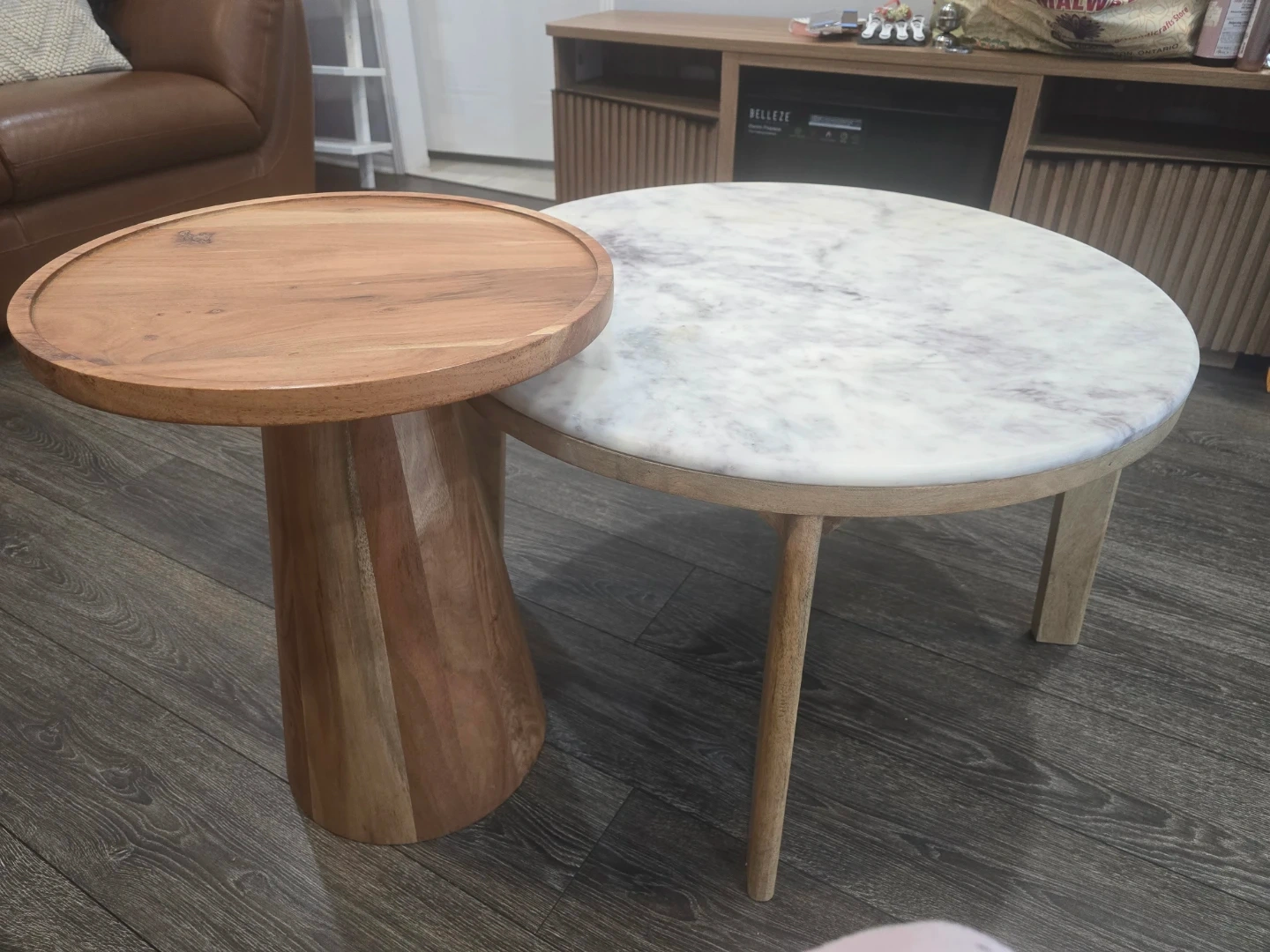 Selling a set of nesting coffee tables! One is a round marble table with light wood legs, and the other is a smaller, round wooden table with a unique pedestal base. They're a stylish addition to any living room!