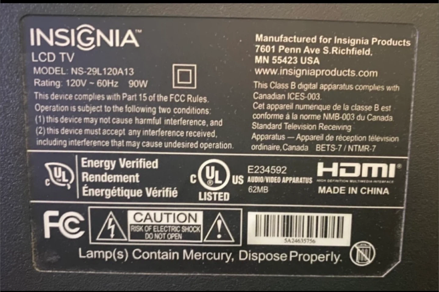 Selling an Insignia 29-inch LCD TV. The model number is NS-29L120A13. It comes with a remote control, model number NS-RC03A-13. It has various input/output ports including HDMI, USB, and component video.
