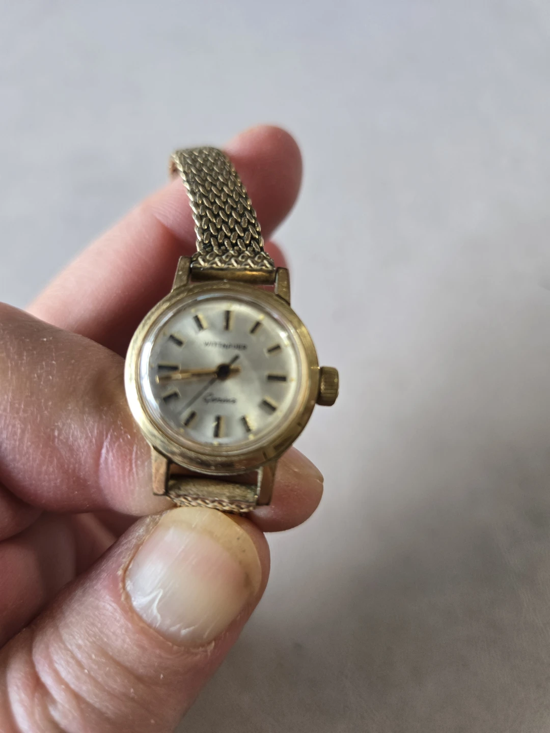 Selling a vintage Wittnauer Geneve ladies watch. It has a gold-tone finish and a unique woven band. A lovely piece for any collection! Not working. May require mechanism cleaning.