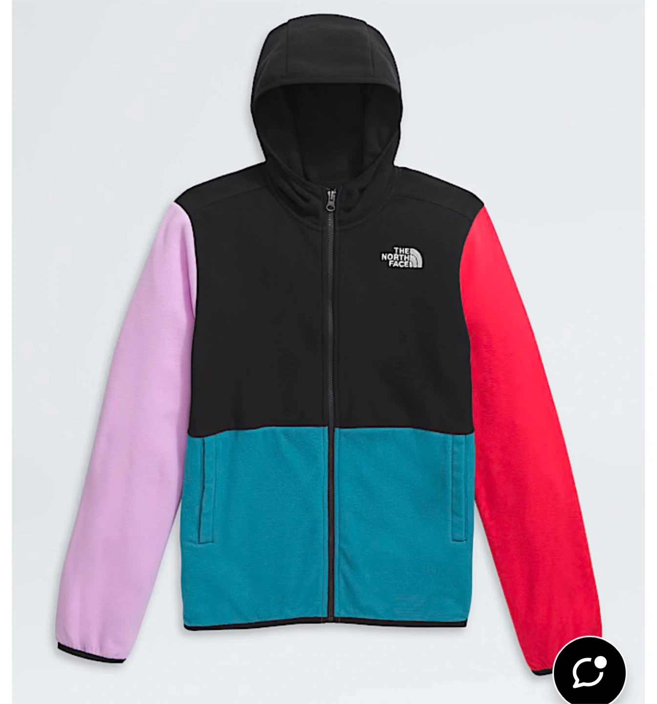 Cozy up in this eye-catching The North Face fleece hoodie! The colour block design features black, teal, pink, and red, making it a fun and stylish choice for cooler days. Perfect for layering or wearing on its own!