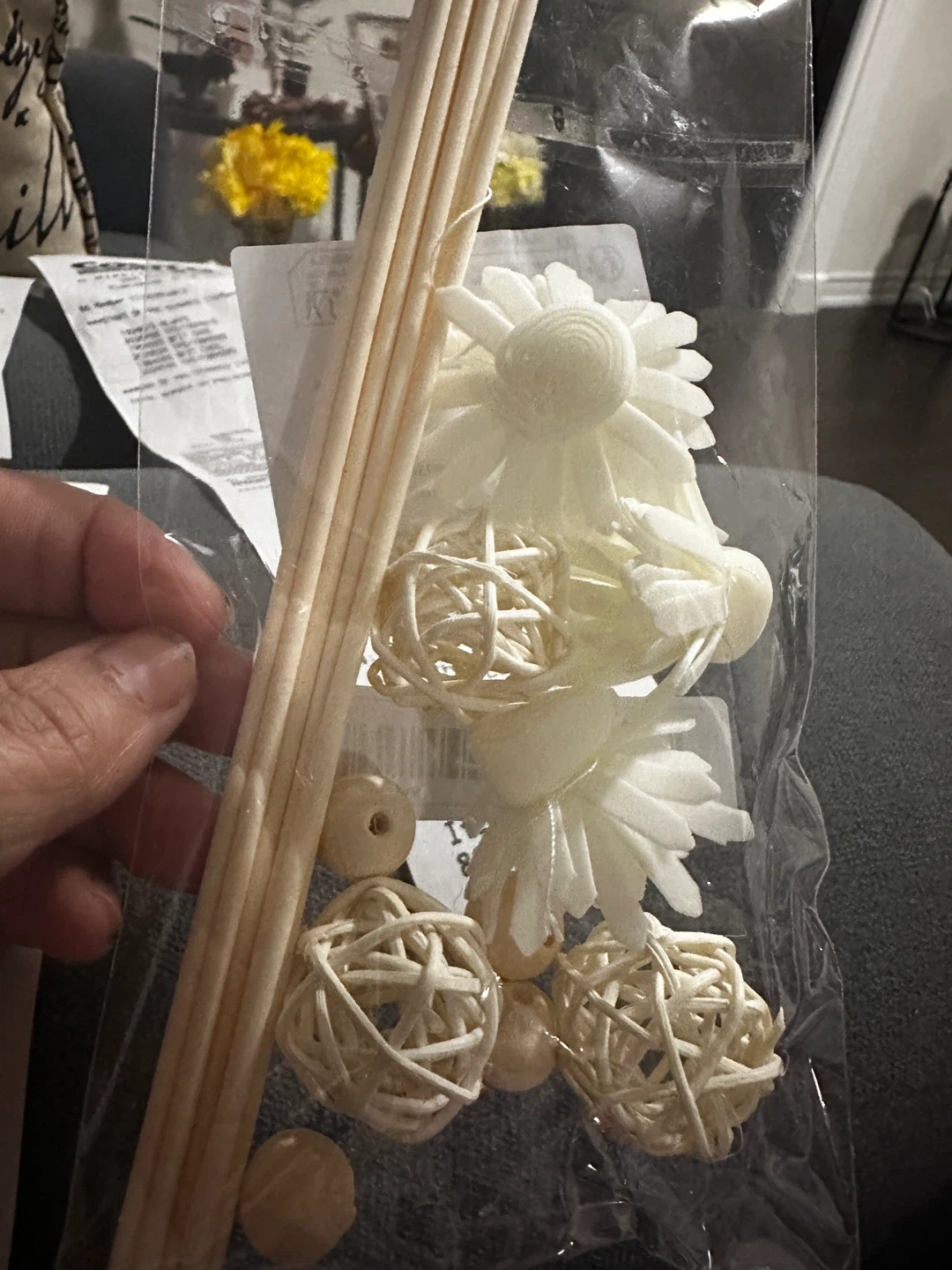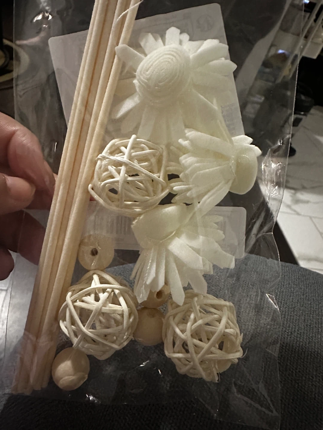 Selling a brand new DIY reed diffuser set! It comes with all the materials you need to create your own diffuser, including reeds, decorative balls, and flowers. Perfect for adding a touch of fragrance and style to any room in your home