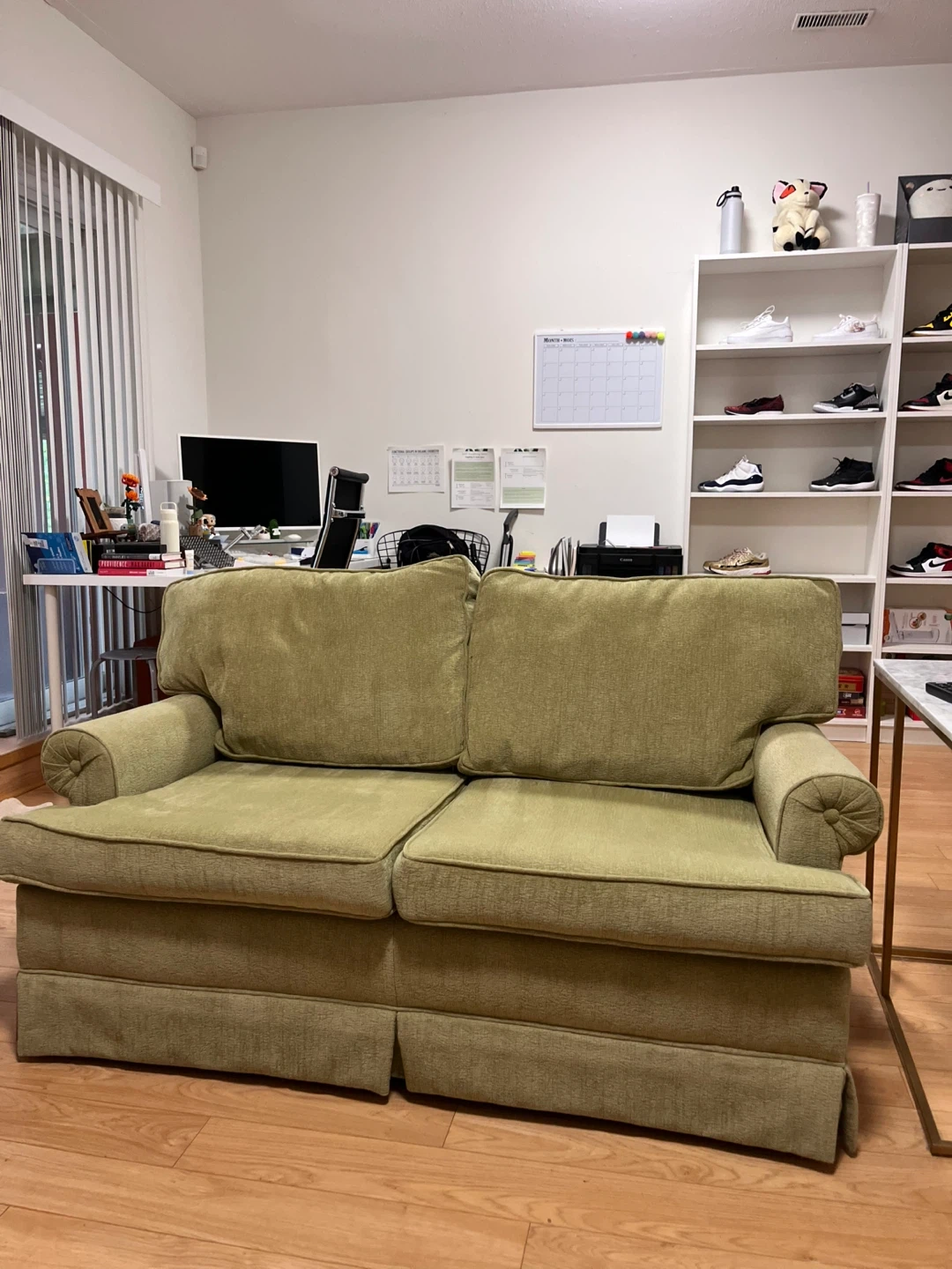 Selling a comfy green sofa. It's in good condition and would be great for a living room or den. It has a classic design that would fit in with many different styles of decor; if interested just message me; Thanks