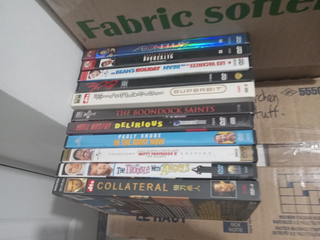 Selling a collection of DVDs, including titles like The Matrix, I, Robot, and Collateral. Perfect for movie nights!