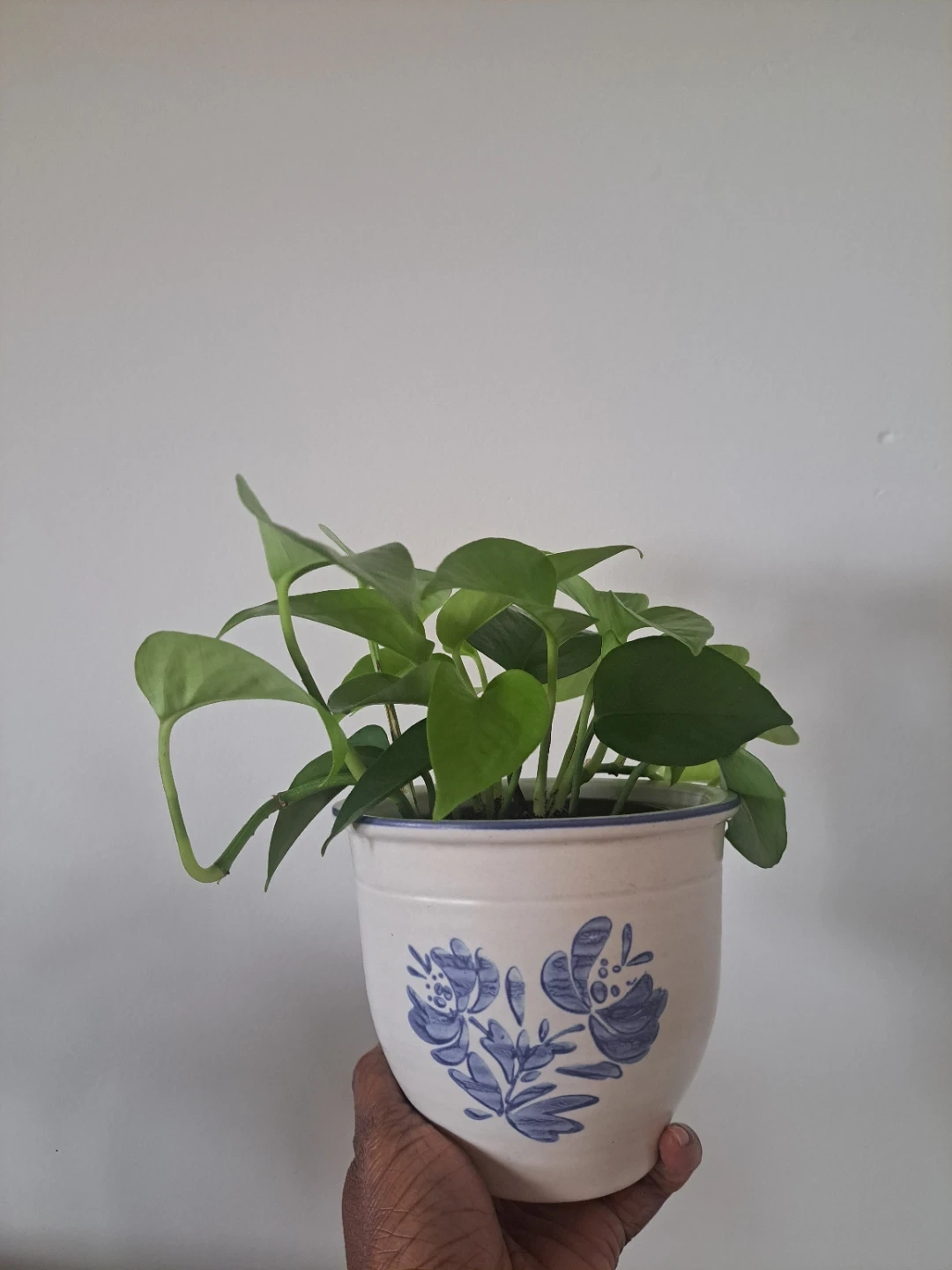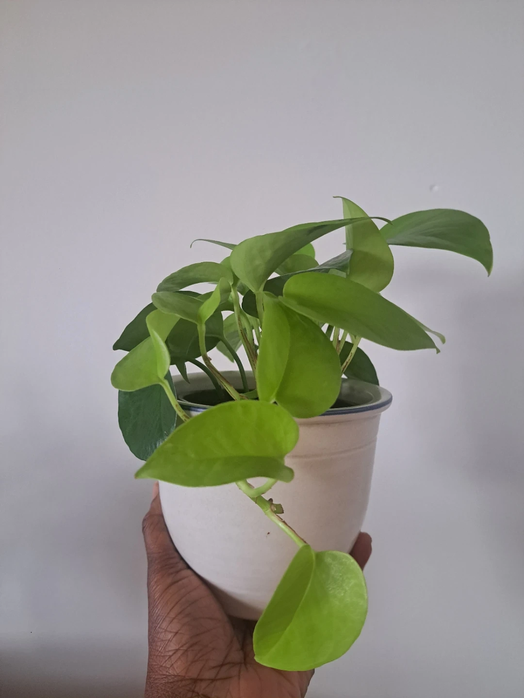 Selling a healthy neon pothos plant in a decorative pot. I put a few jade leaves in and think she looks spectacular. It's a great indoor plant that's easy to care for and adds a touch of greenery to any space.