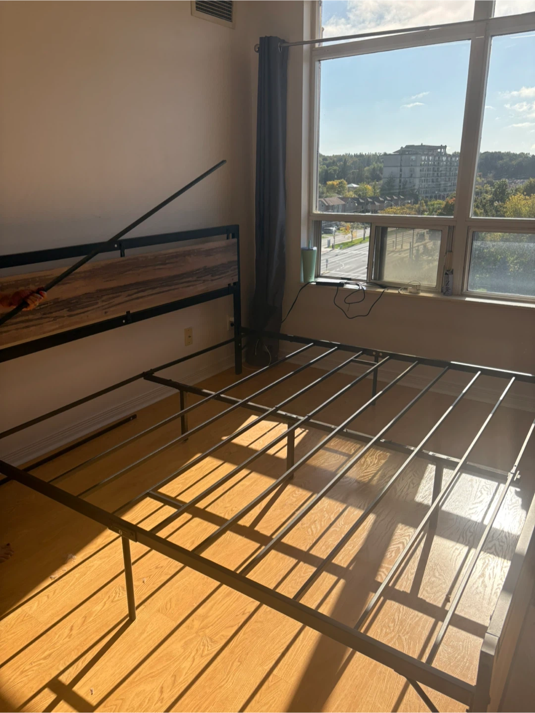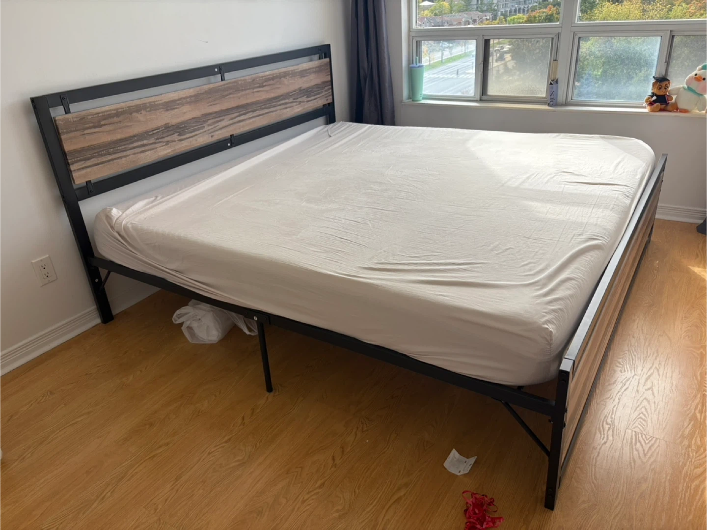 Selling a king size bed frame with a sturdy metal frame and a wooden headboard. It's in great shape and ready to use. Perfect for adding a modern touch to your bedroom!