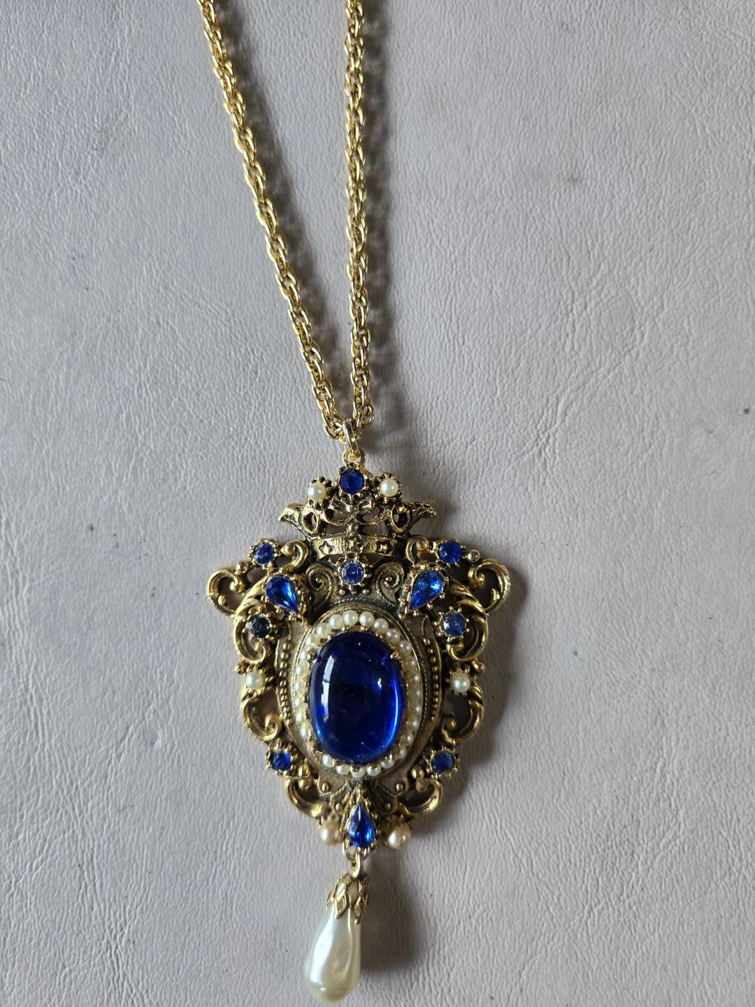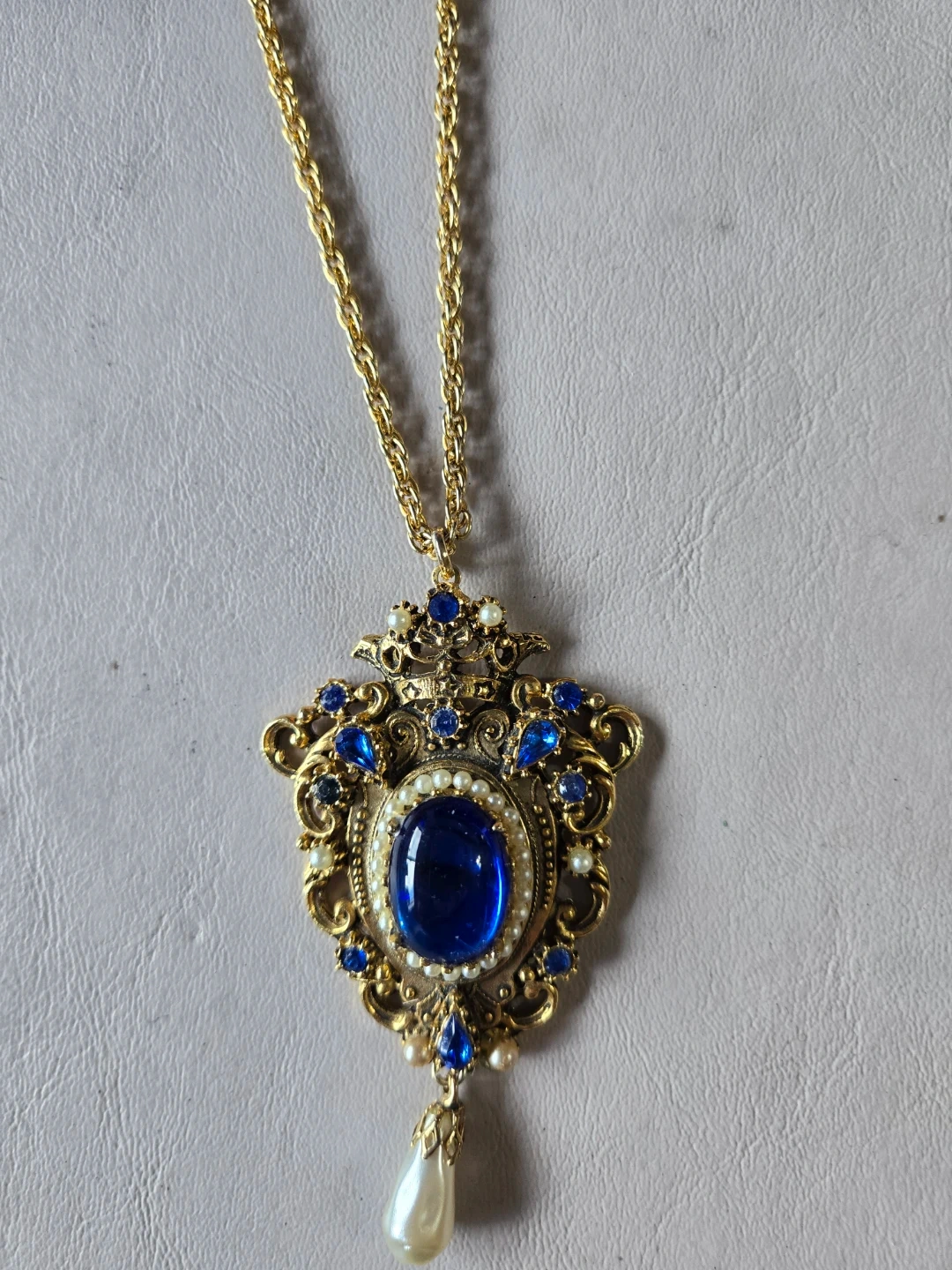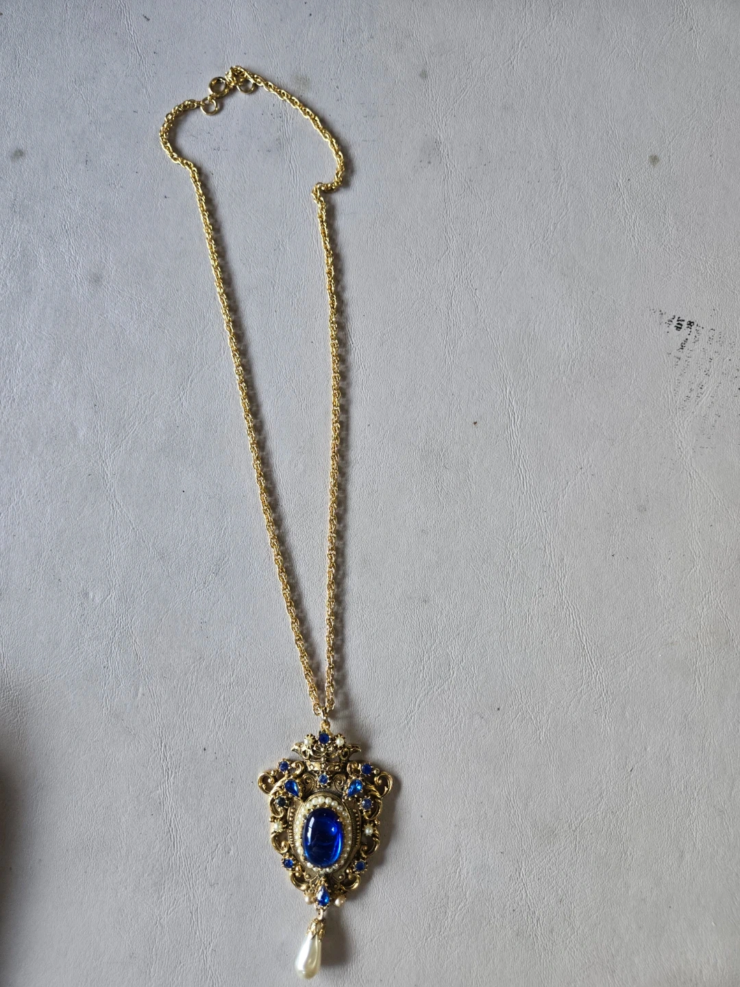 Beautiful Avon necklace featuring a large blue stone surrounded by smaller blue stones and faux pearls, all set in a gold-tone metal. It's in great condition and ready to add a touch of elegance to any outfit