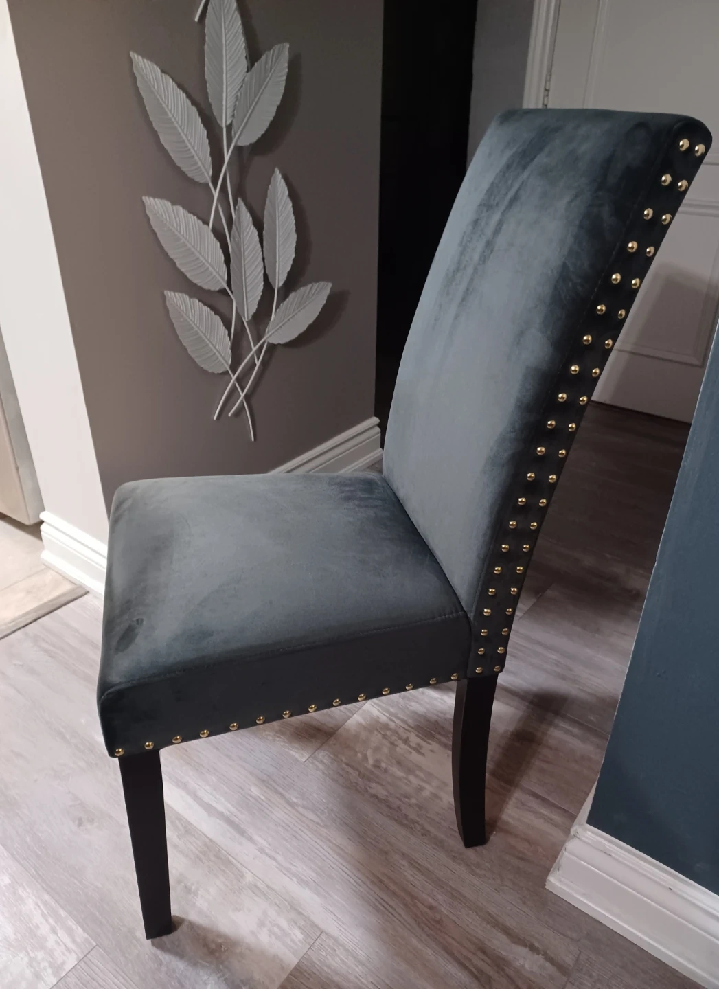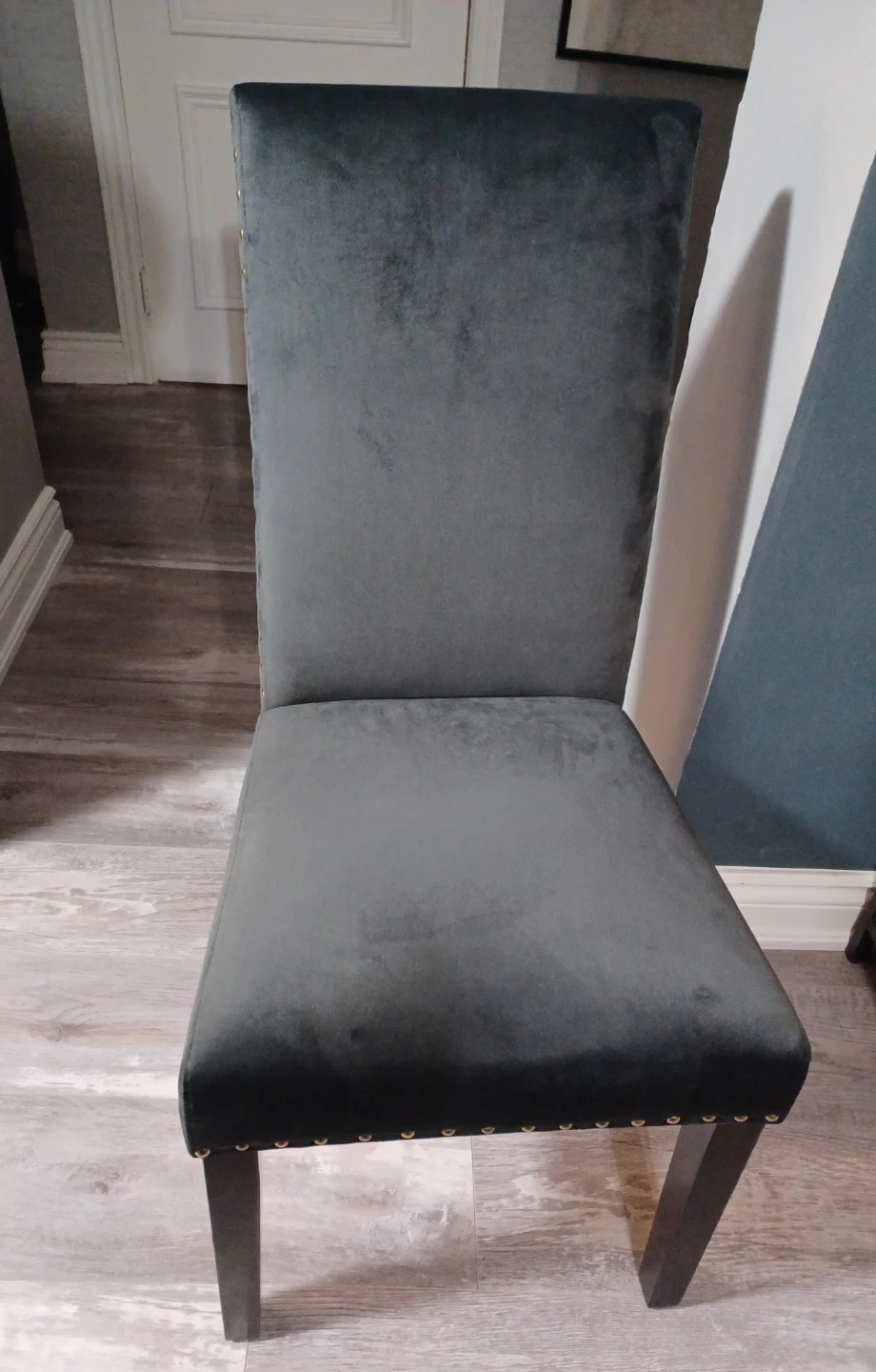 Selling 2 stylish dining chair in a grey velvet. Almost new condition and would look lovely in any dining room or as accent chairs! The chairs feature a nailhead trim for a touch of elegance.