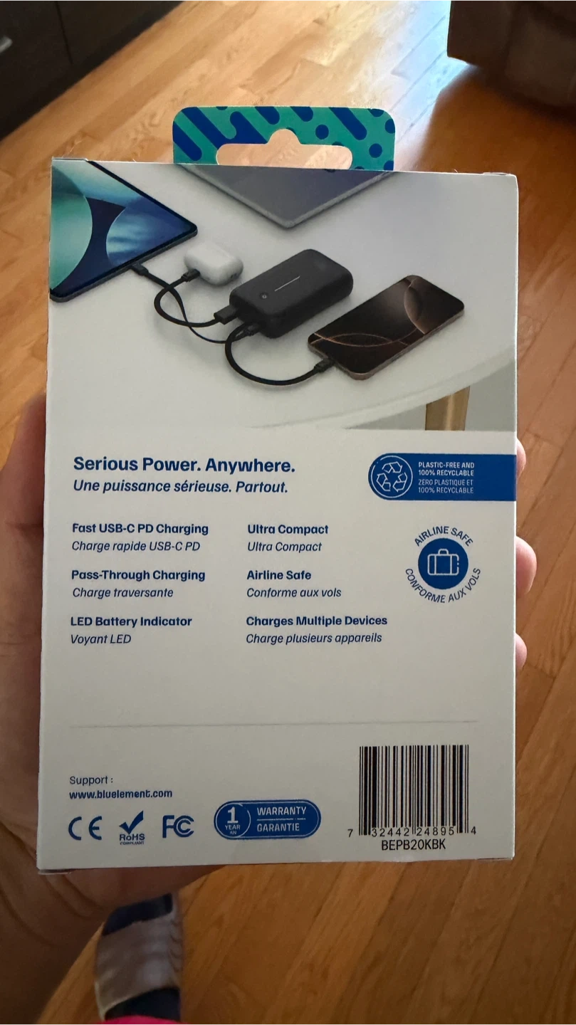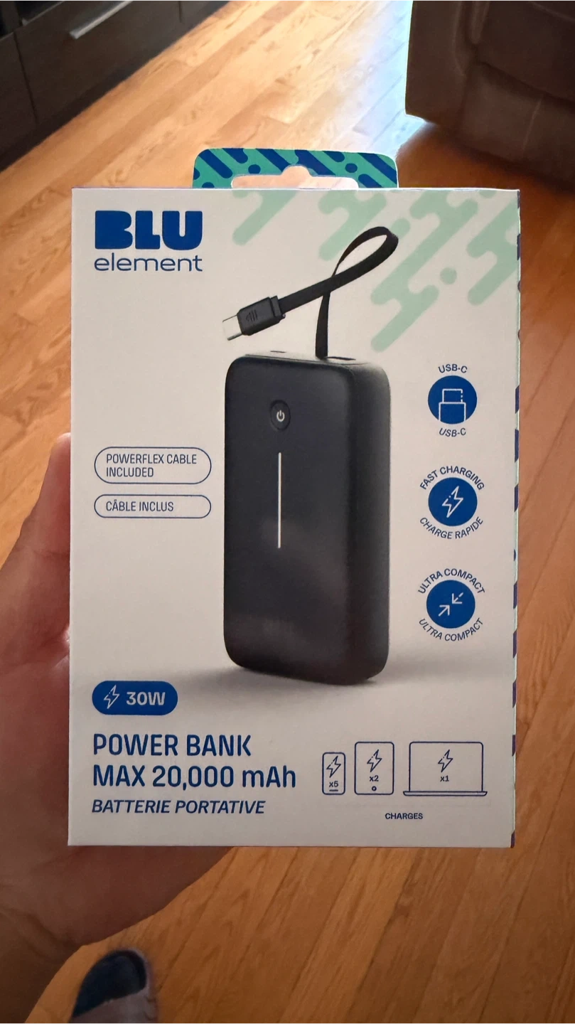 Selling a brand new Blu Element 30W Power Bank, still in its original packaging! It has a maximum capacity of 20,000 mAh and comes with a PowerFlex cable. It's ultra compact and airline safe, perfect for travel or everyday use. Charges multiple devices with fast USB-C PD charging