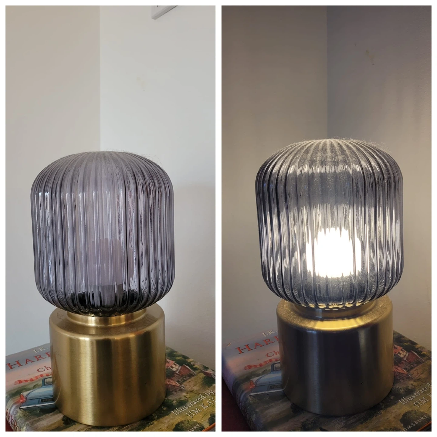 Add a touch of modern elegance to your space with this stylish table lamp! It features a ribbed glass shade and a sleek gold base. Perfect for adding a warm glow to any room