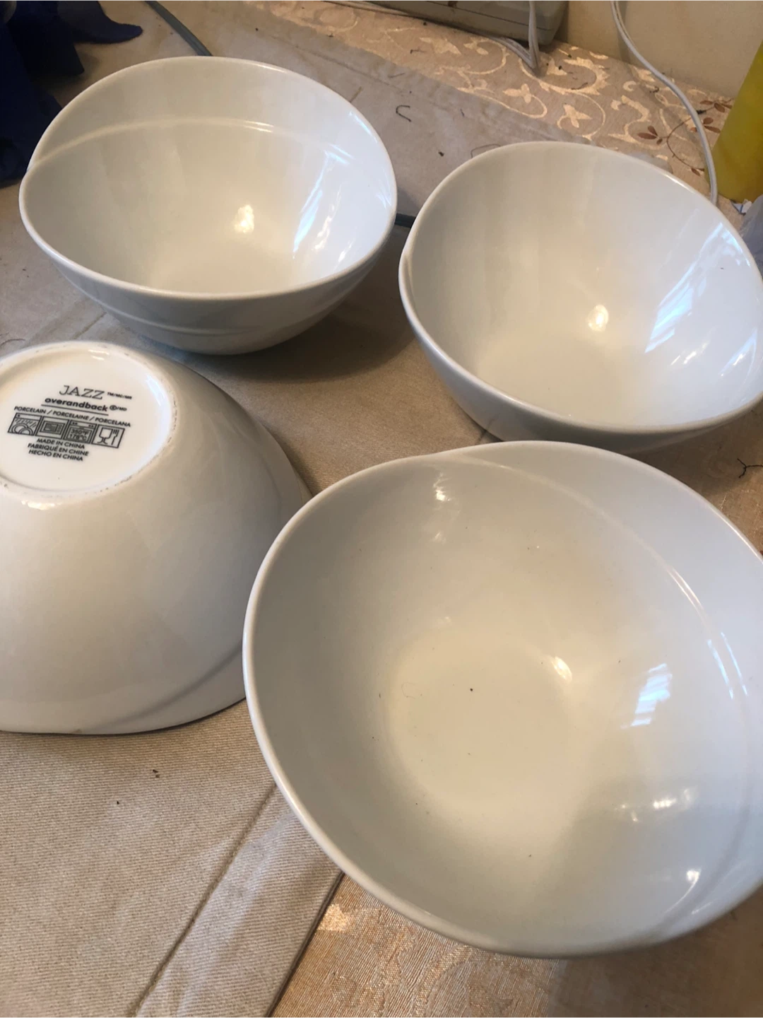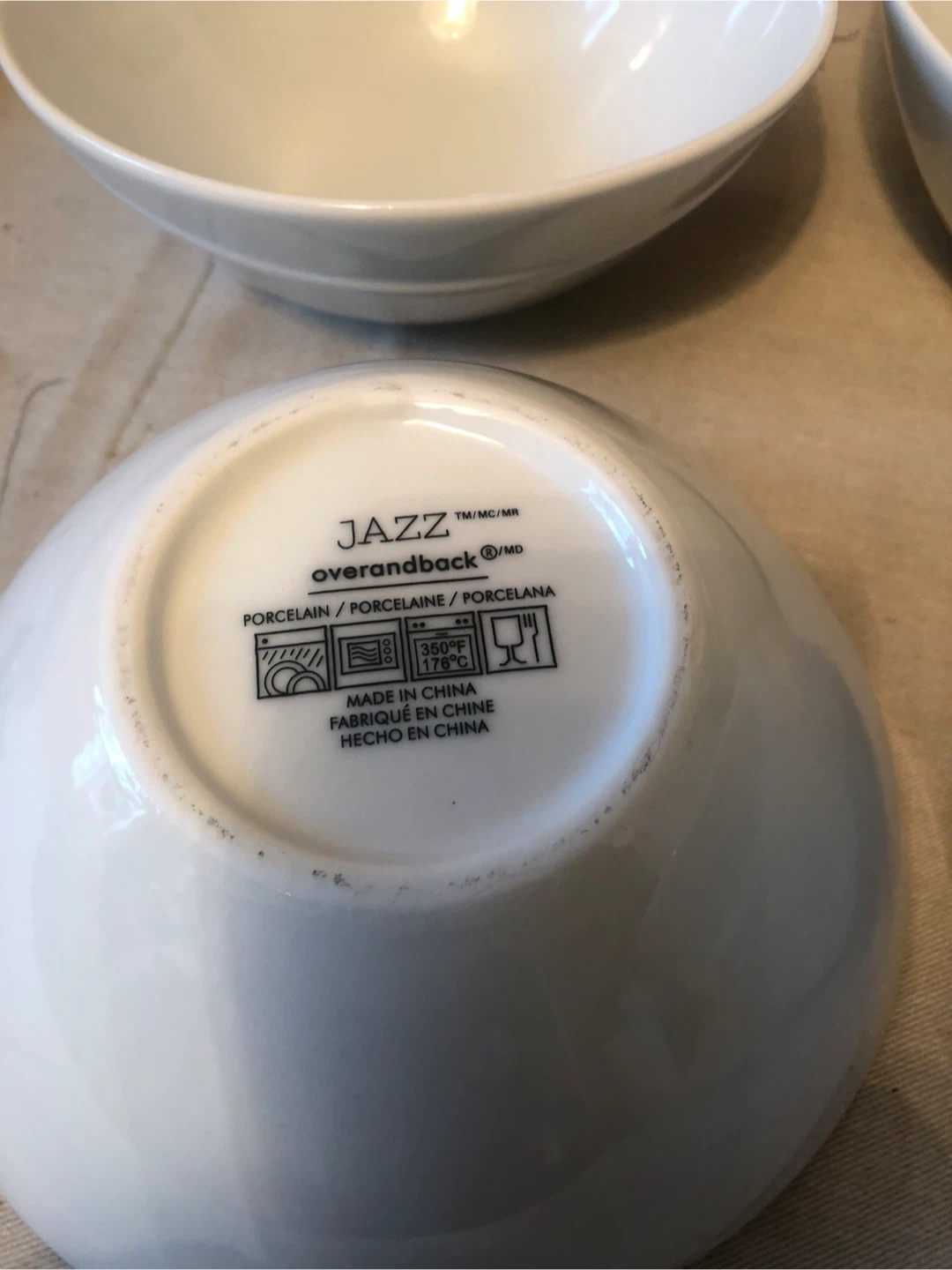 Selling a set of Over and Back JAZZ porcelain bowls. They are white and made in China. Perfect for everyday use!