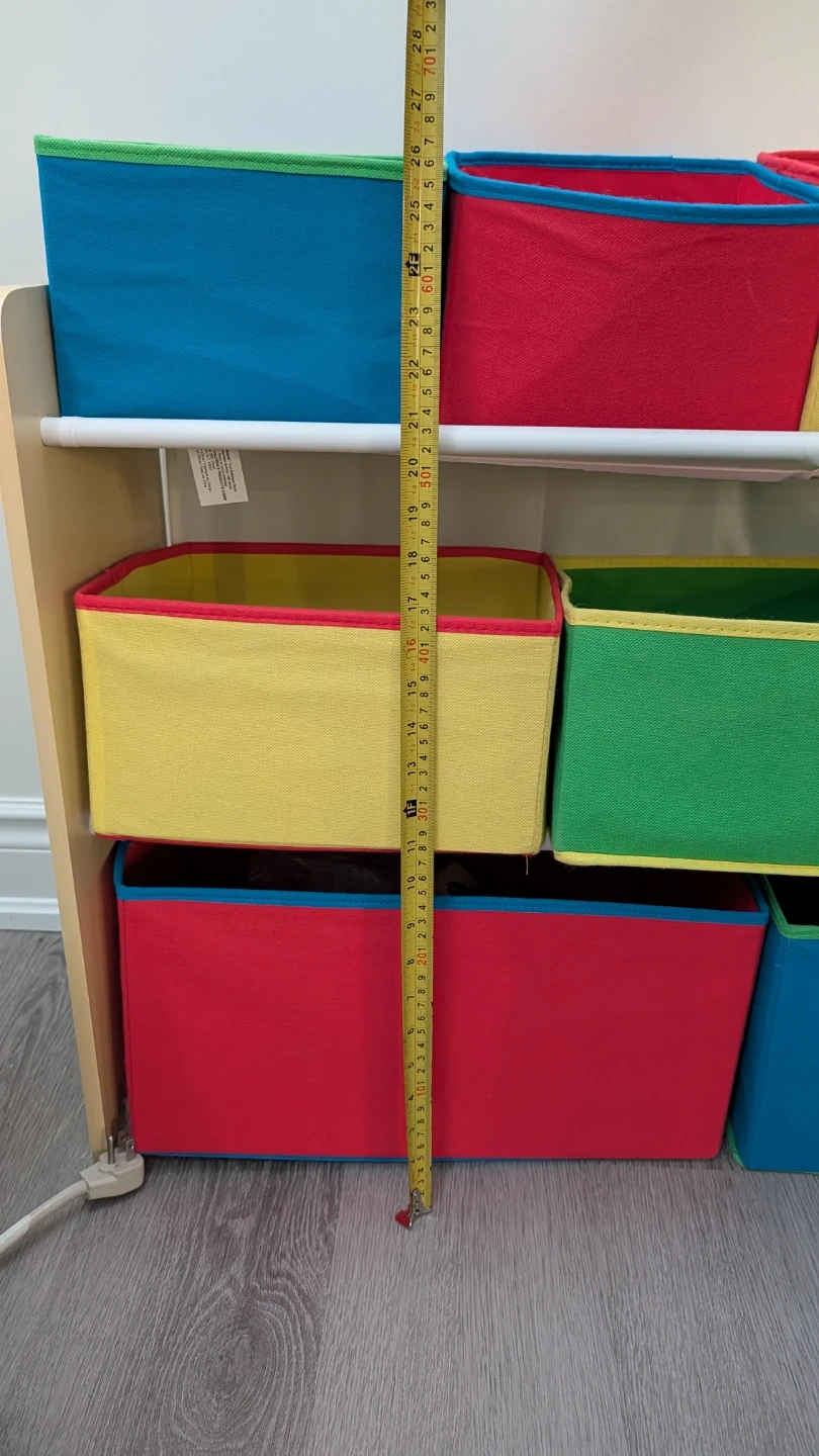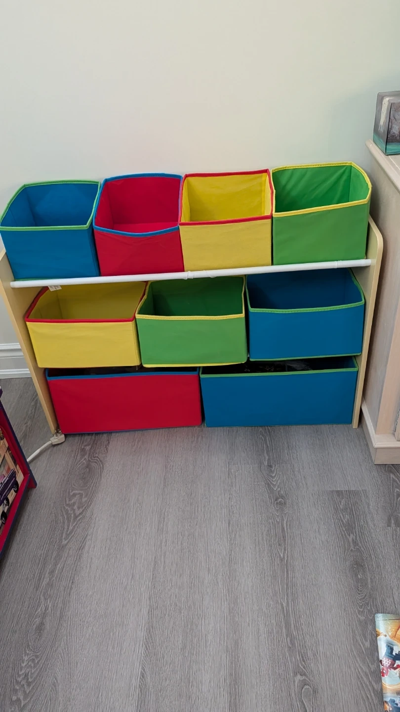 Selling a colourful kids' toy storage shelf with bins! It's in great shape and perfect for organizing toys, books, and other items. The shelf features multiple bins in various colours, making it a fun and functional addition to any playroom or bedroom. It measures approximately 36 inches in height and 32 inches in width