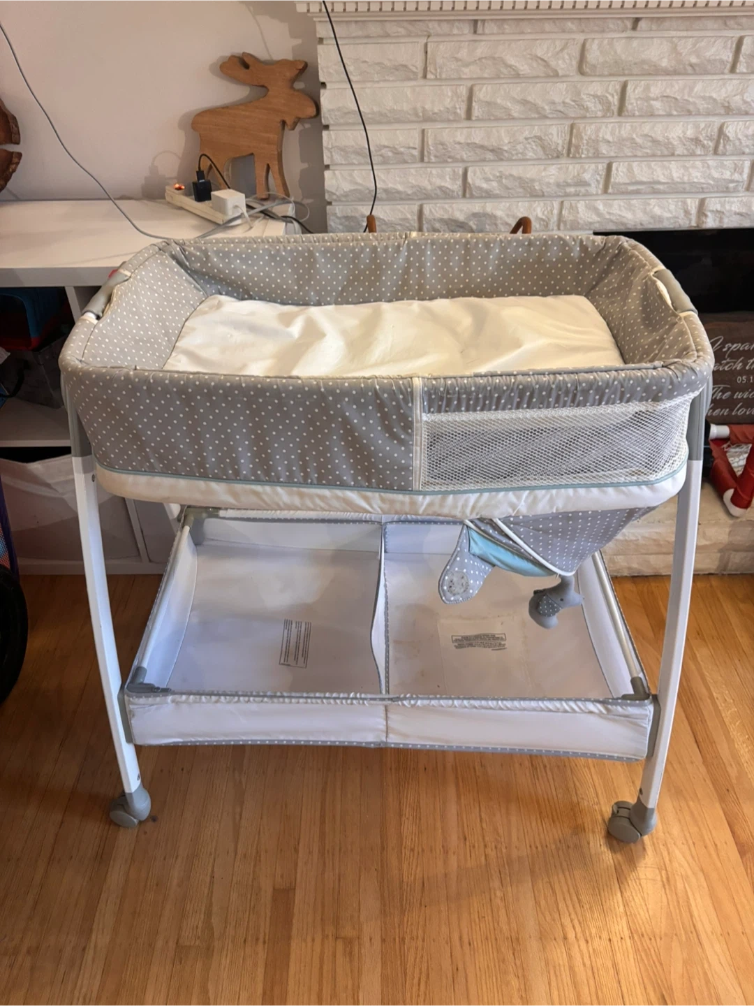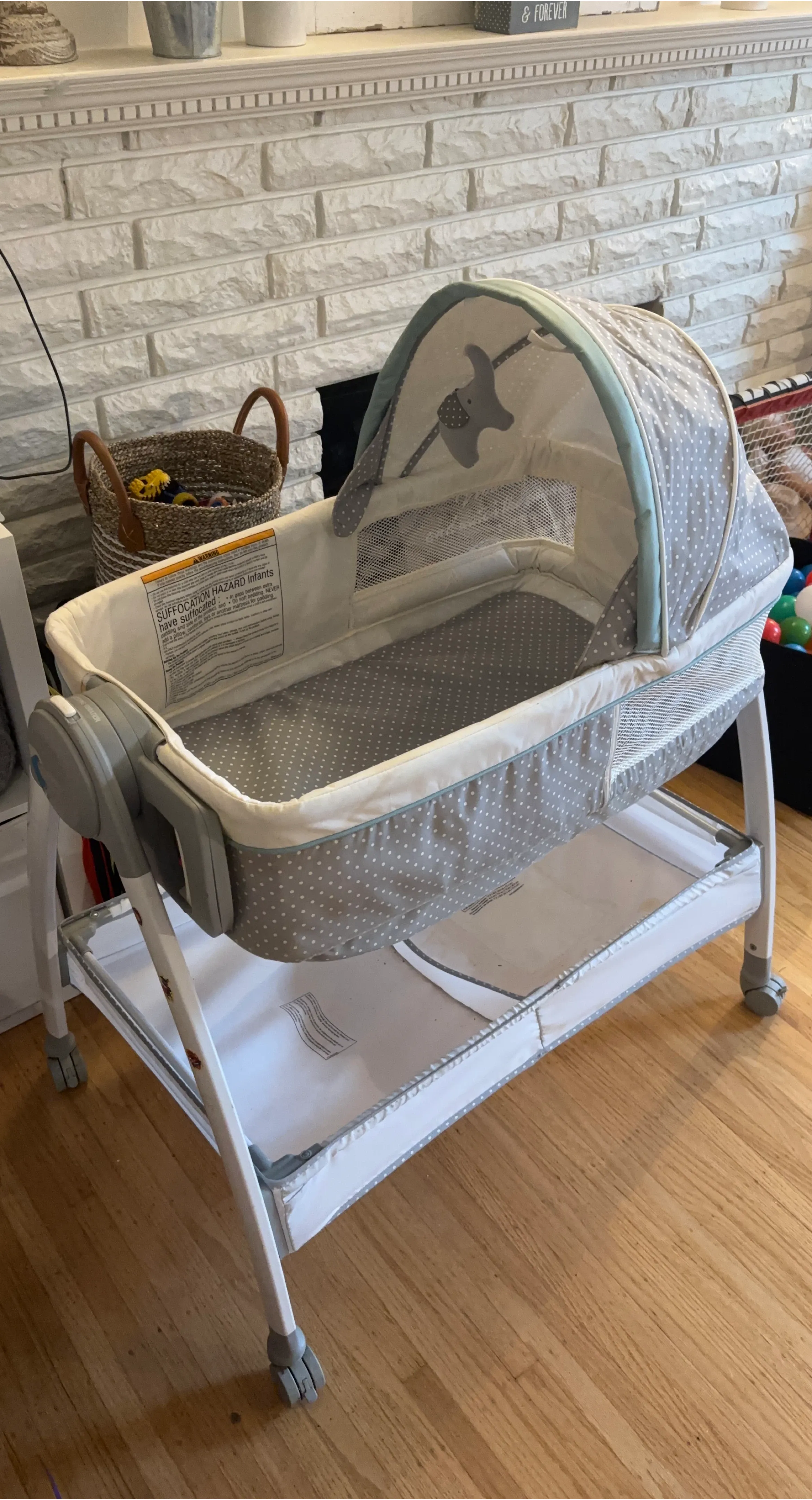 Selling a gently used infant soothing bassinet. Perfect for newborns and infants, it provides a cozy and secure sleeping environment. It features a sturdy frame with wheels for easy mobility and a retractable canopy to shield your little one from light.
