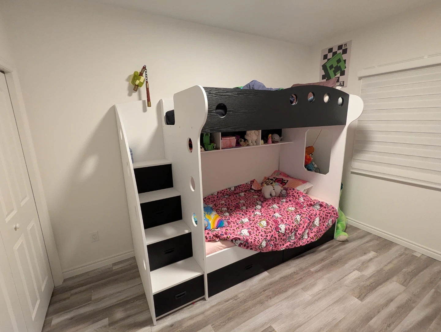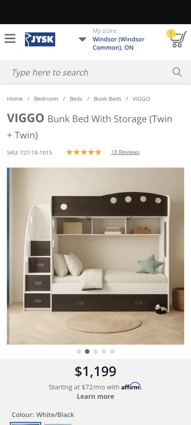 Selling a VIGGO bunk bed with storage, perfect for a kids' room! This twin-over-twin bunk bed comes in a stylish white and black colour. Retails for $1,199.