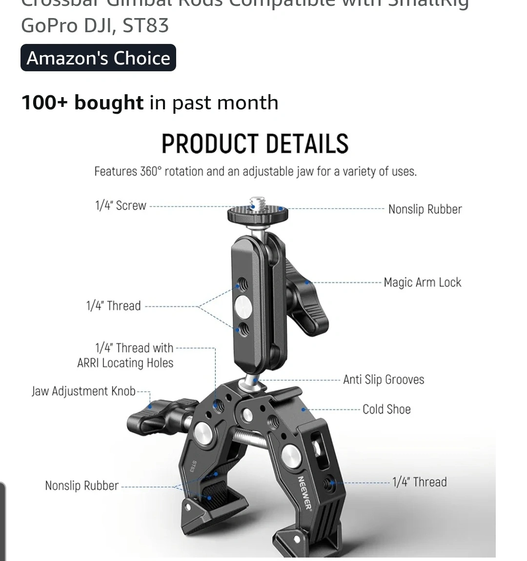 NEEWER Super Clamp with 3" Dual Ballhead Magic Arm, Cold Shoe, 1/4" 3/8" Threads, Phone/Action Camera Mount Adapter for Desk Tripod Tube Crossbar Gimbal Rods Compatible with SmallRig GoPro DJI, ST83.