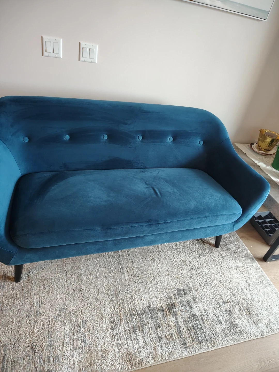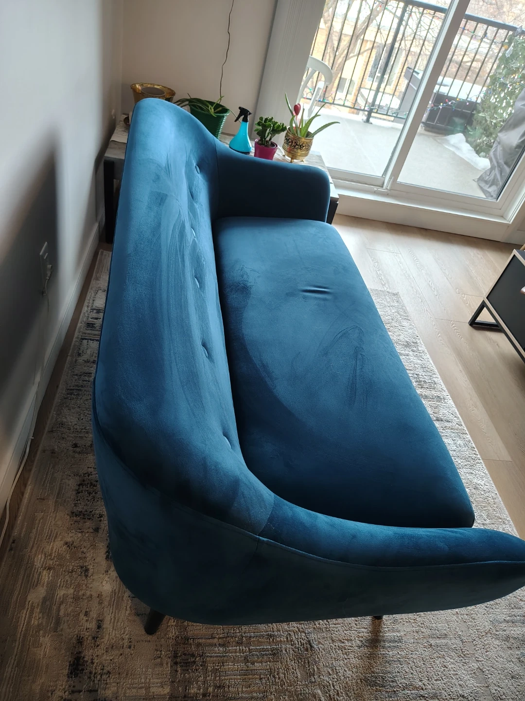 Selling a lovely blue velvet 3 seat sofa. It's in good condition and would be a great addition to any living space. The velvet material gives it a soft and luxurious feel!