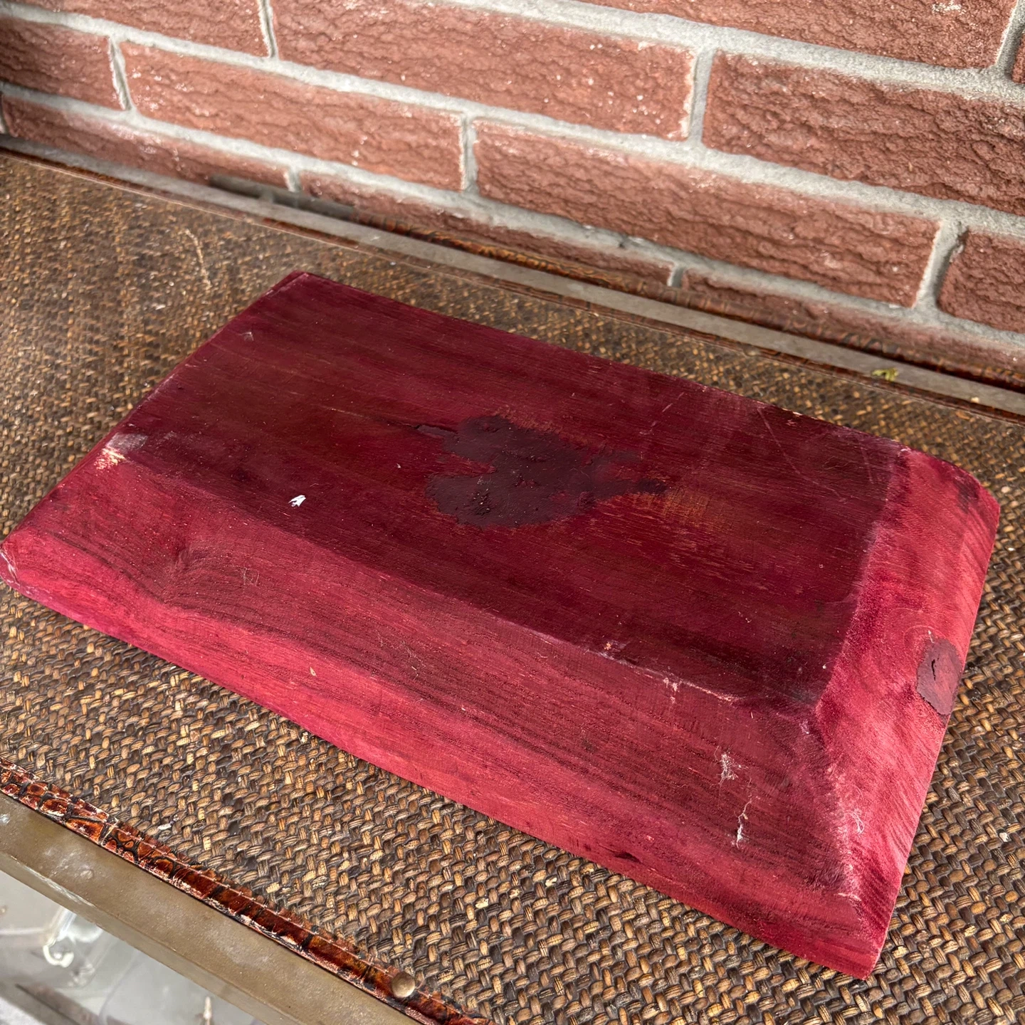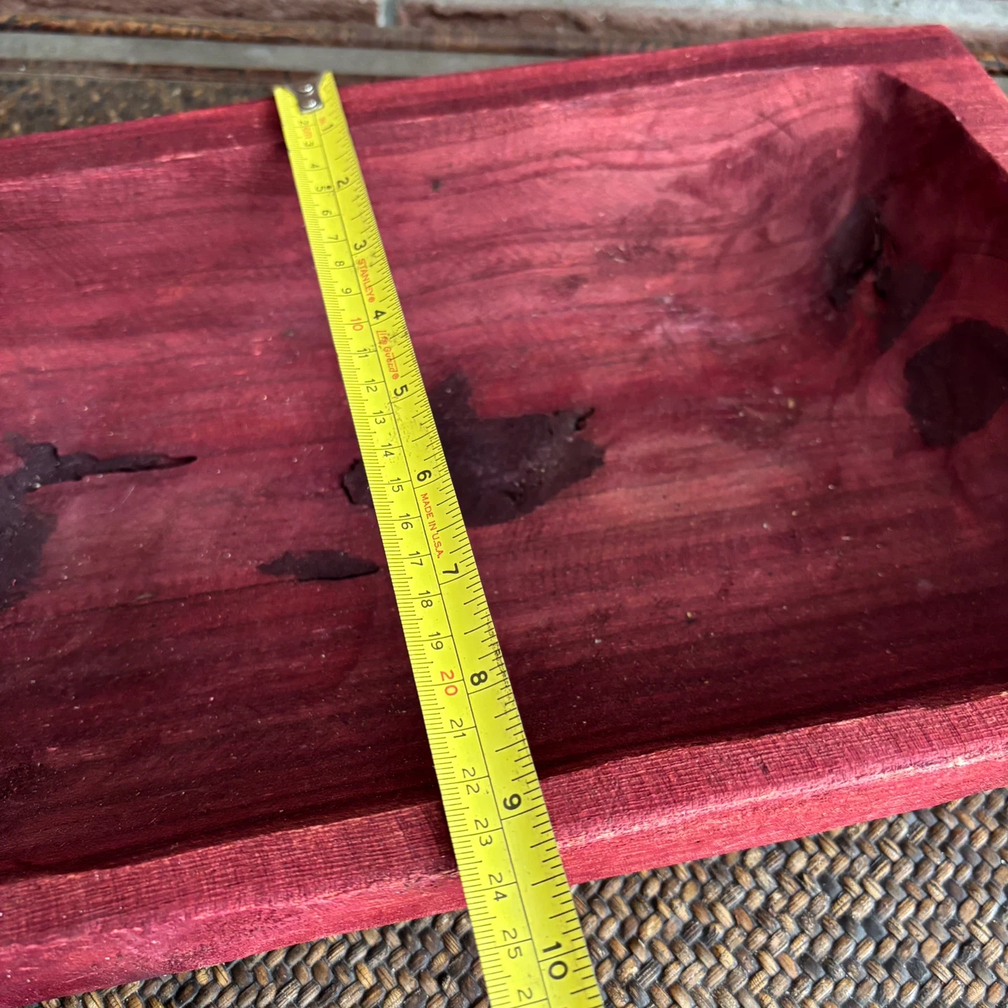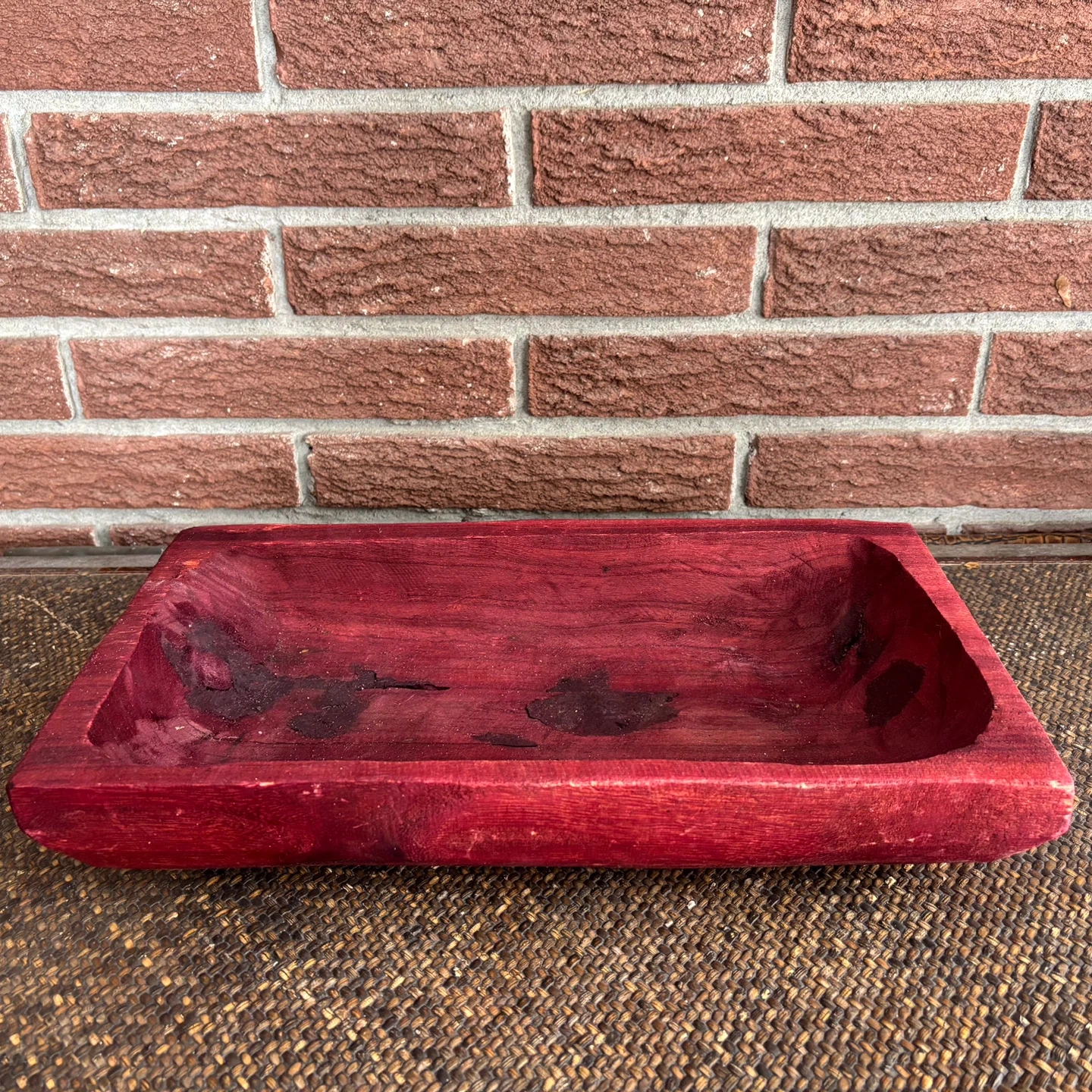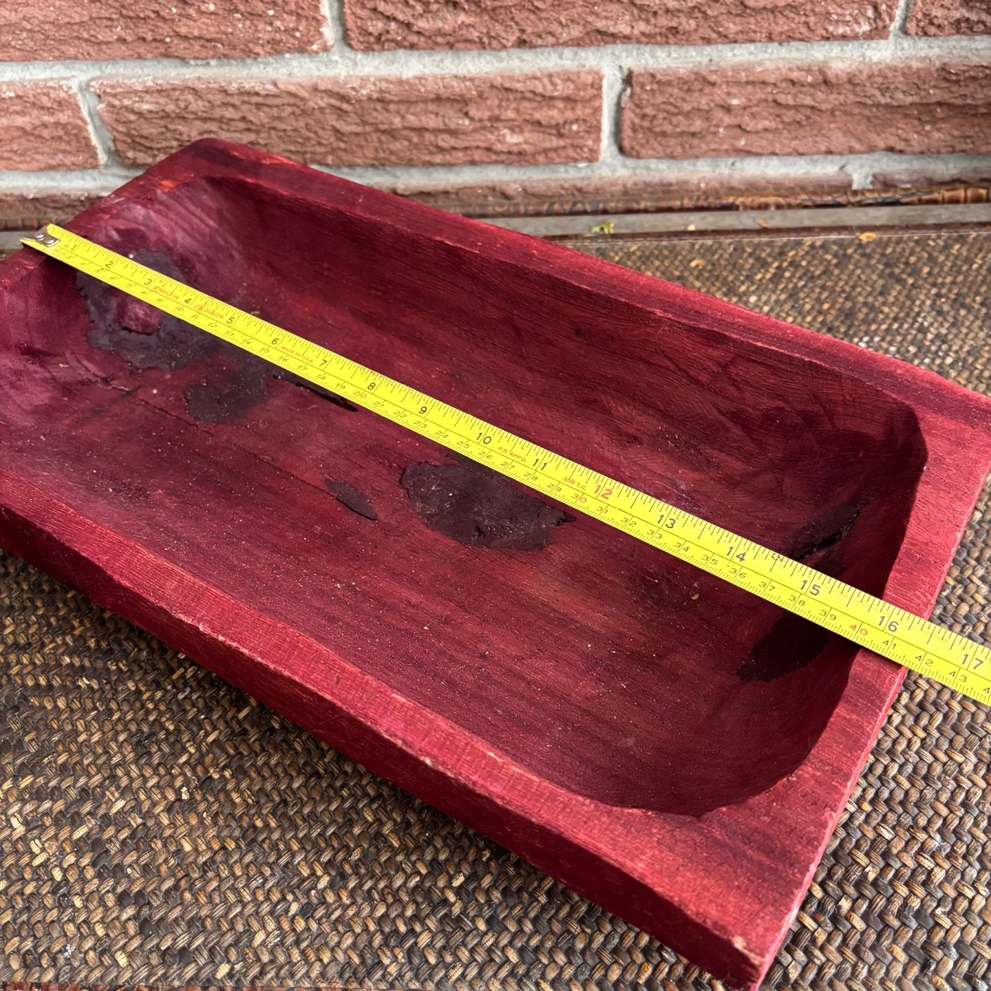 Selling a handmade red-stained wood “dough” bowl or trug. It has some signs of use, as seen in the pictures. It measures approximately 17 inches long and 10 inches wide.