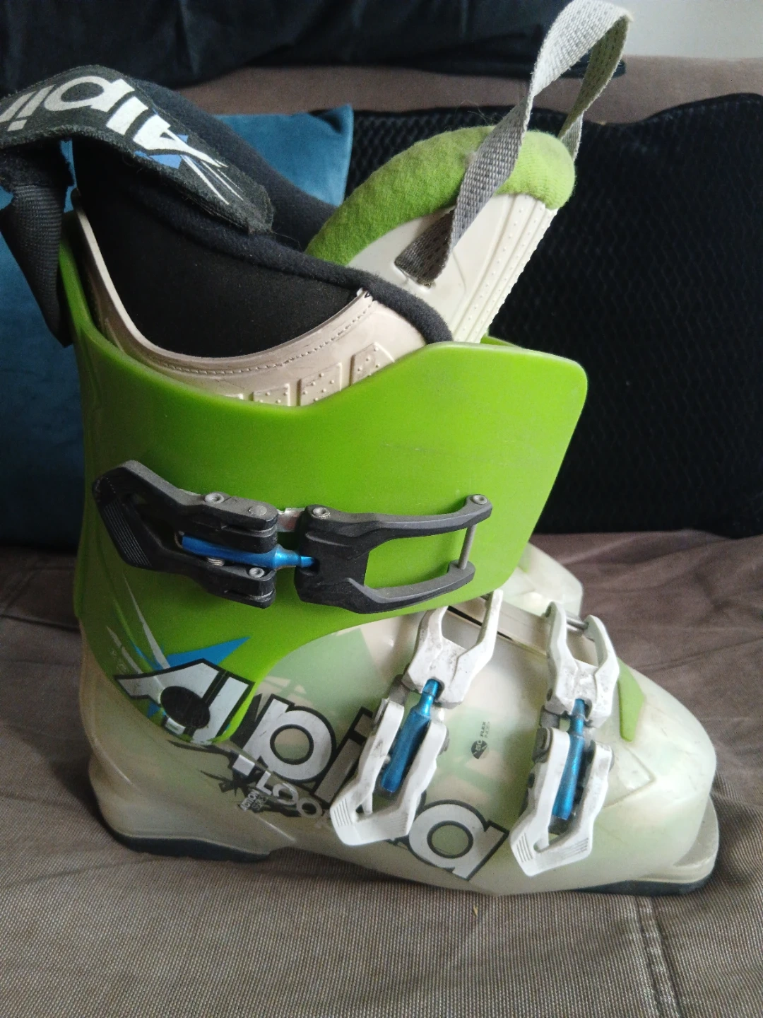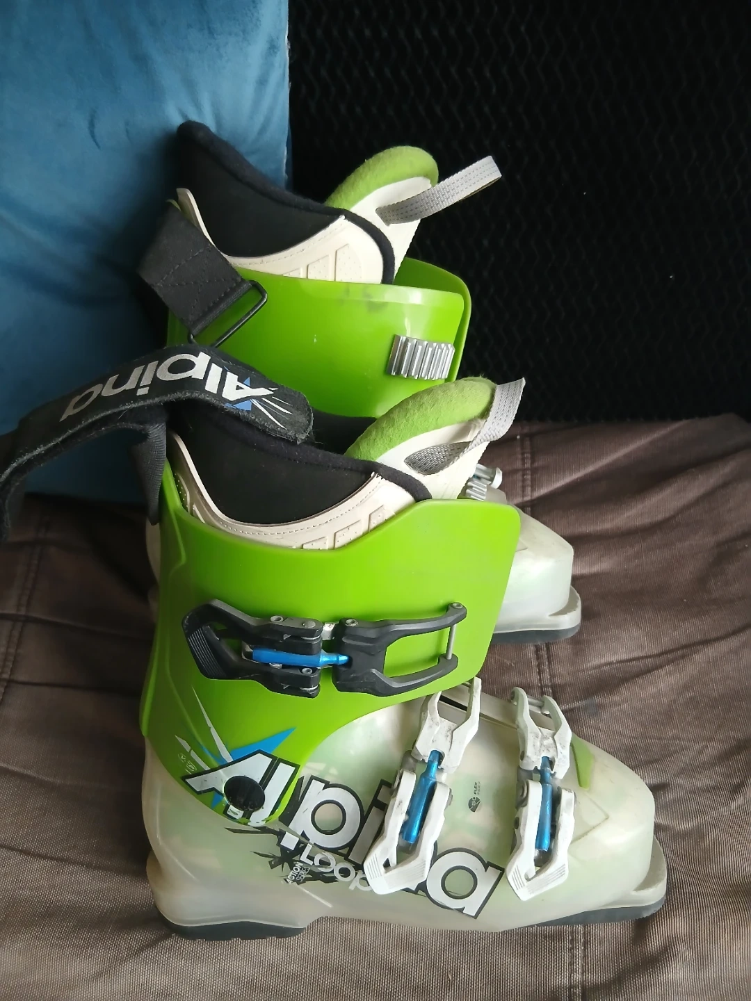 Selling a pair of Alpina ski boots in a vibrant green colour., Size Junior 5.4 Us, or 37,5 European.