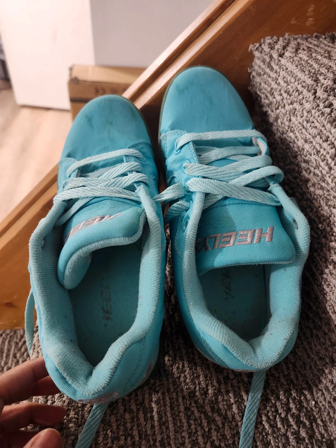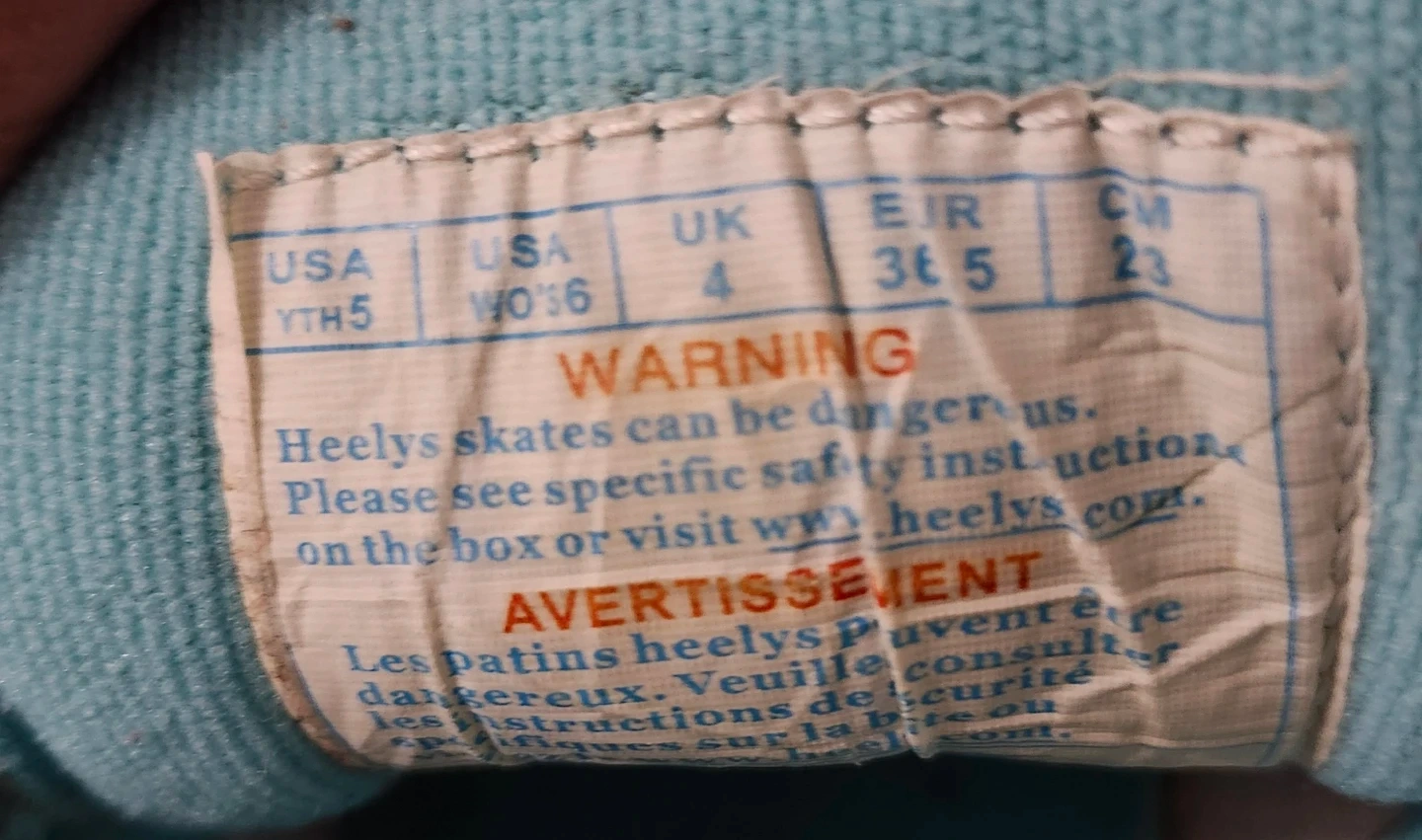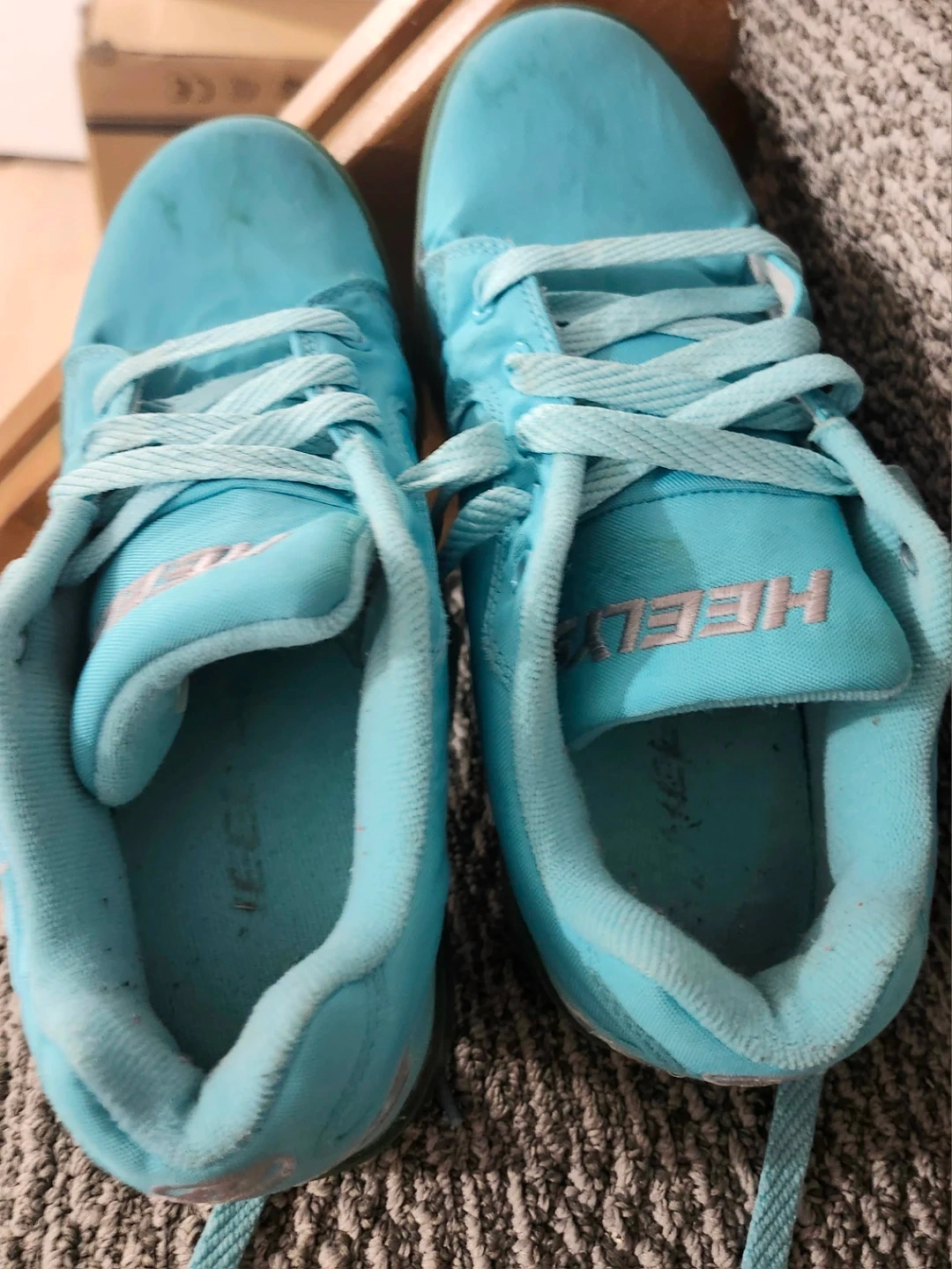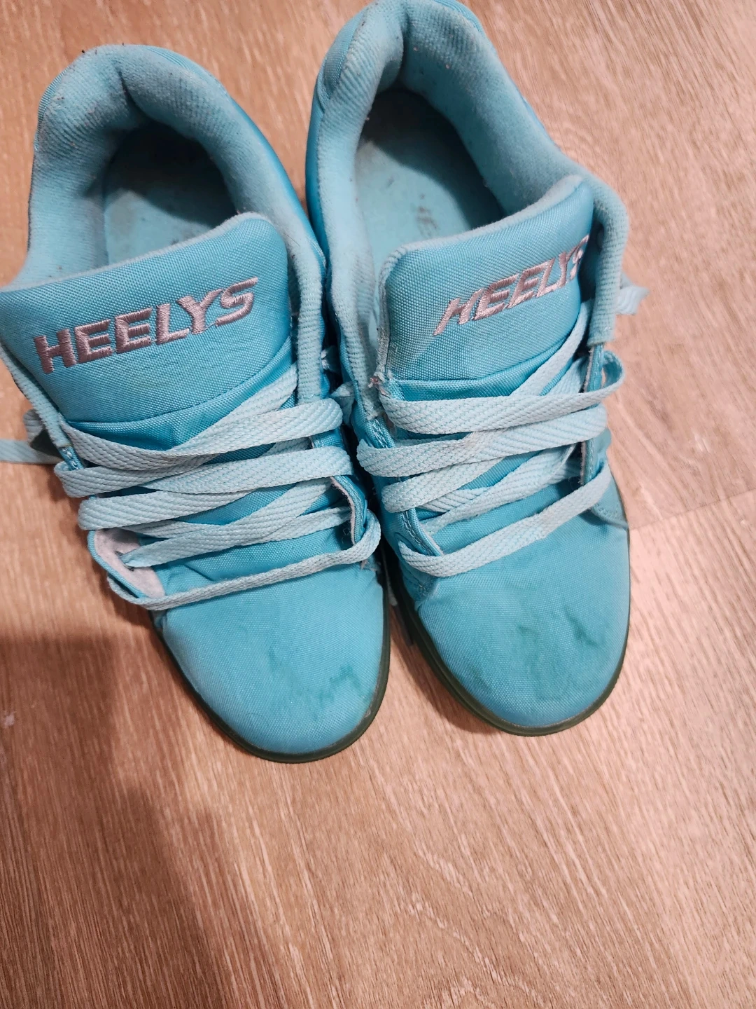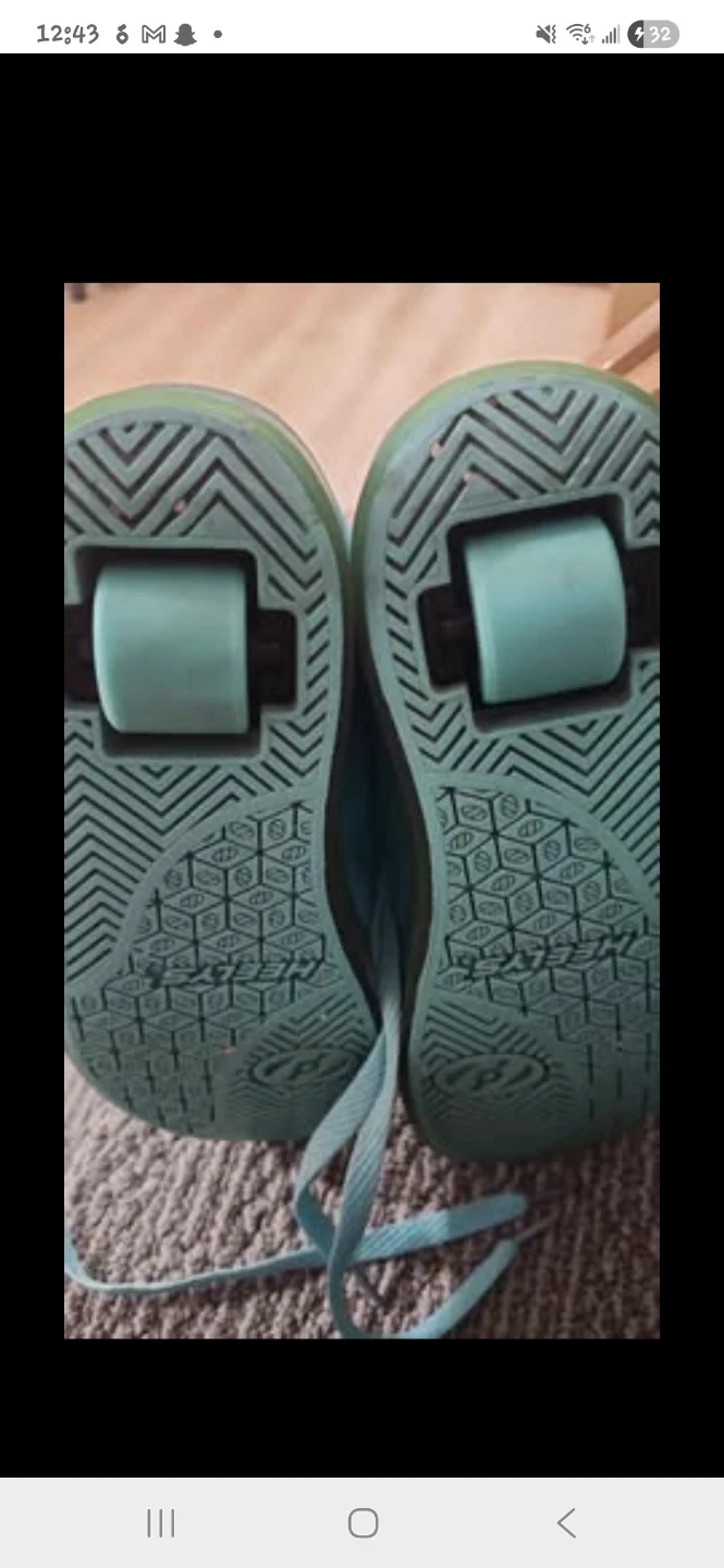 Selling a pair of Heelys roller shoes in youth size 5. They're a fun way to get around and are in good used condition. The colour is a light blue/teal. Great for kids who love to skate, or wheel around!!