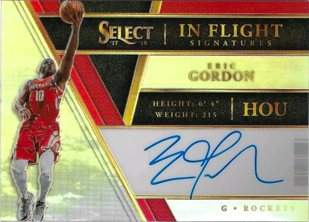 Selling an Eric Gordon auto 'In Flight Signatures' trading card. It's from the 'Select '17-'18' series. The card features Eric Gordon, a player for the Houston Rockets.