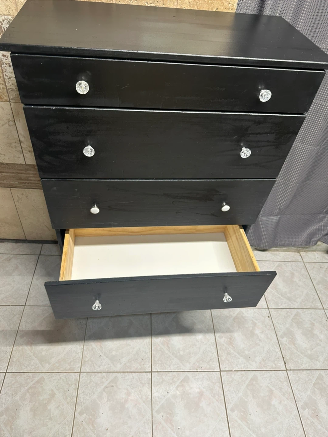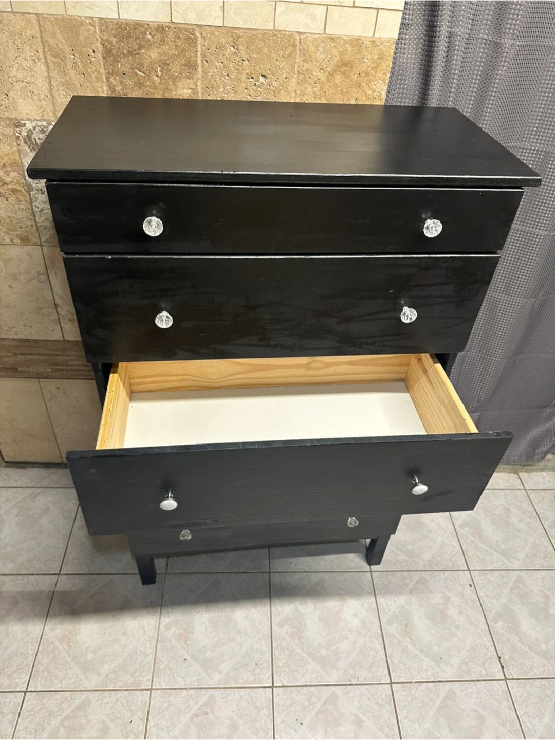 It has crystal-style knobs on each drawer.