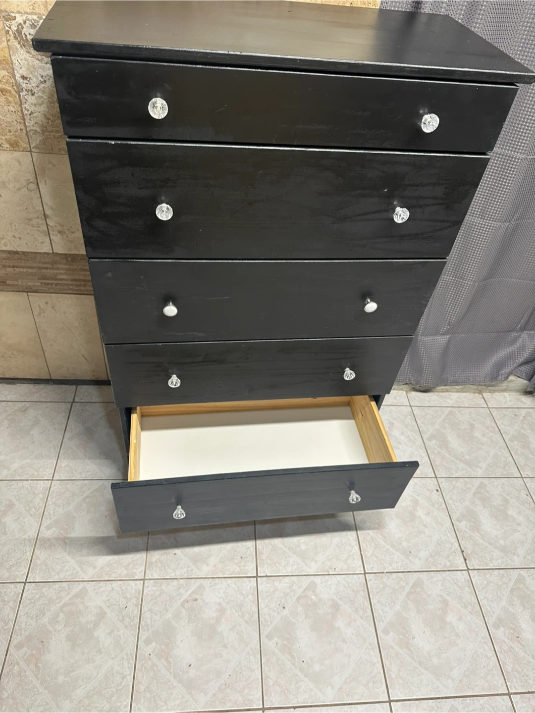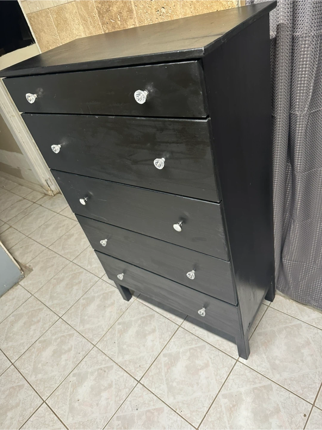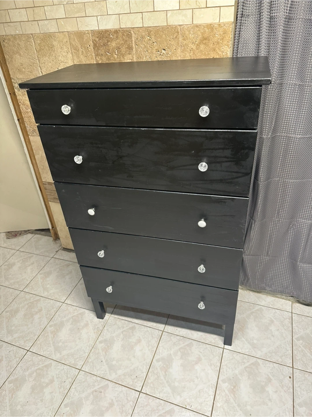 Selling a black dresser / chest of 5 drawers.