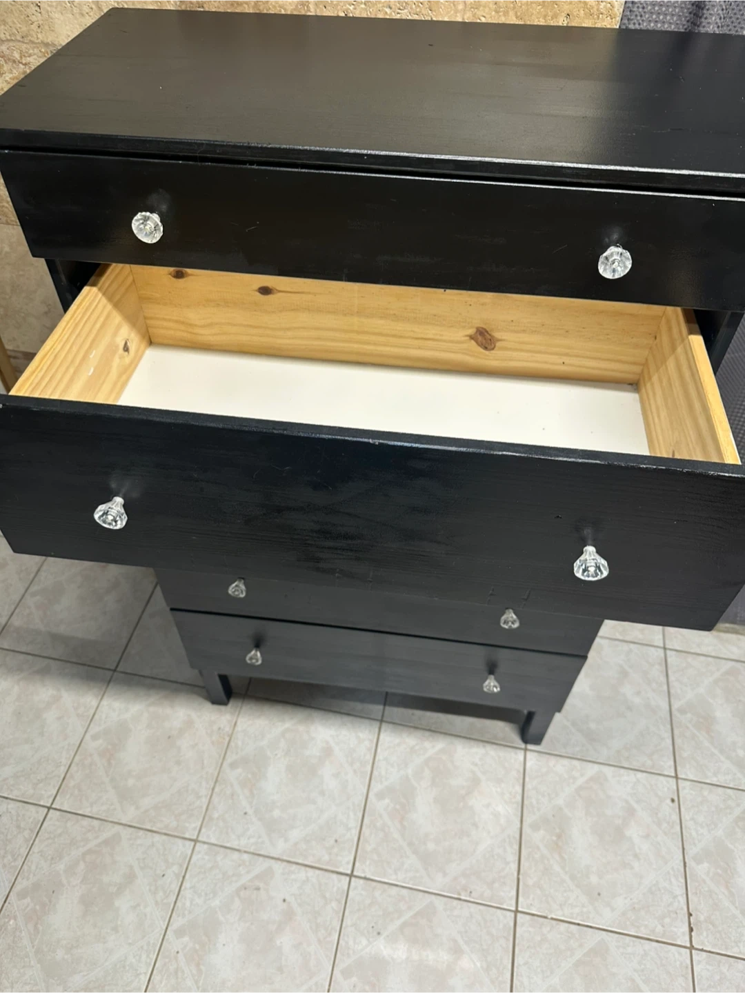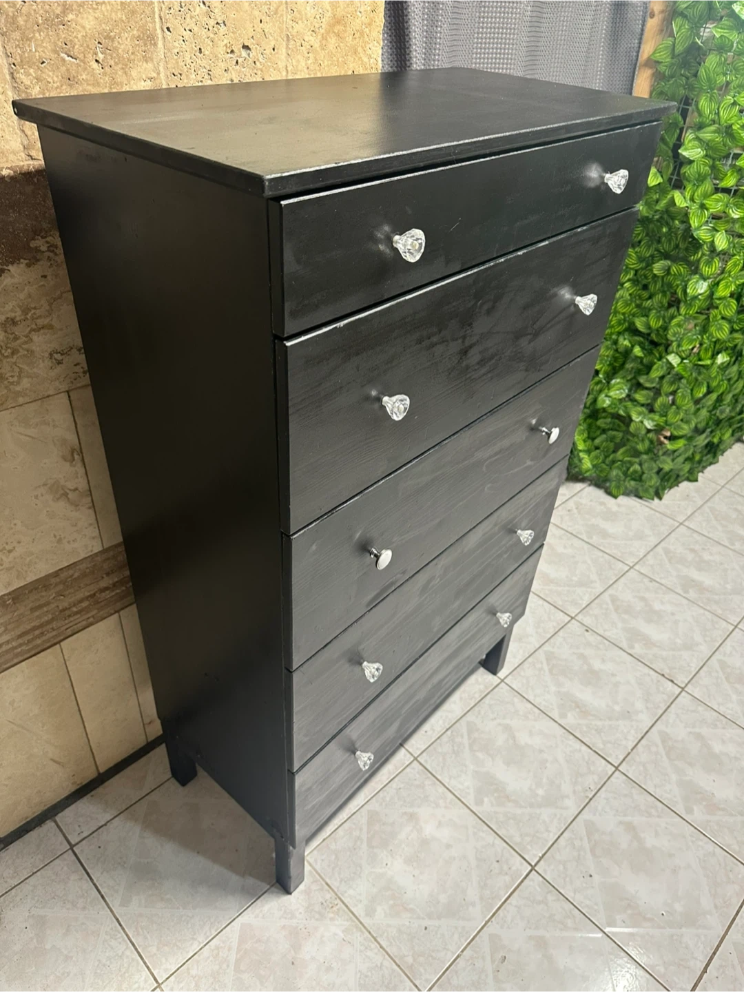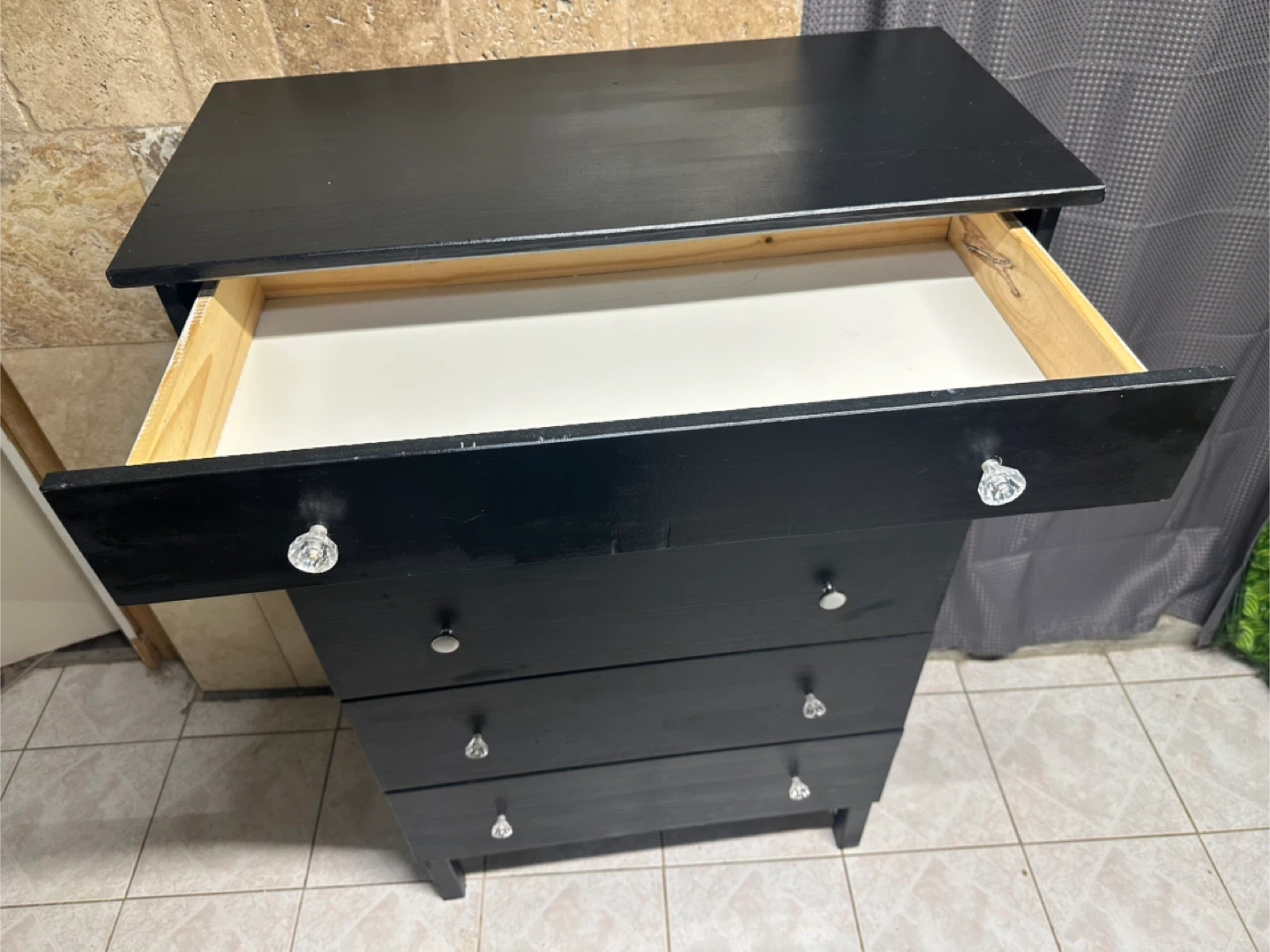 Selling a black dresser / chest of 5 drawers.