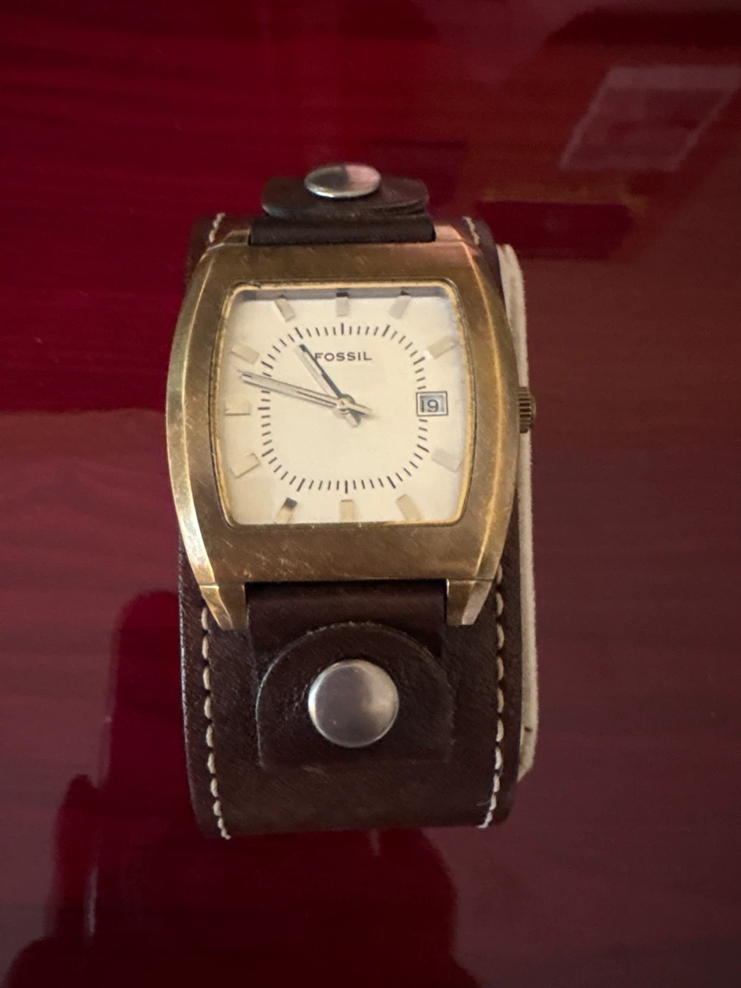 Selling a Fossil watch with a unique brown leather cuff band. It has a square face and a date display. The watch shows some wear, but is overall in good condition!