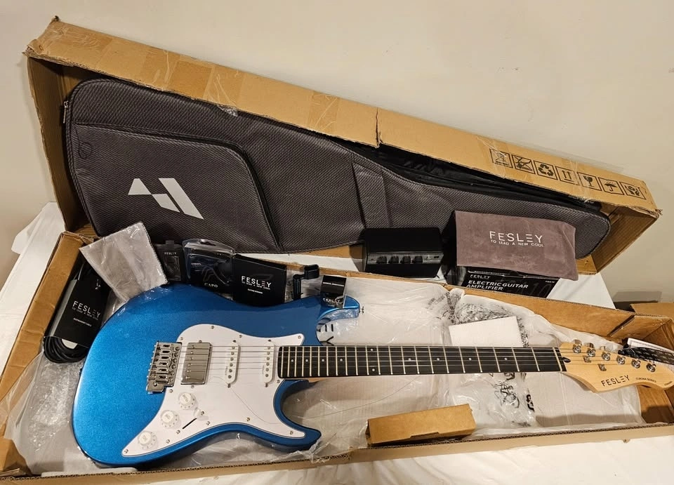 One of the strings is broken but new strings are provided with the guitar. Comes with everything.