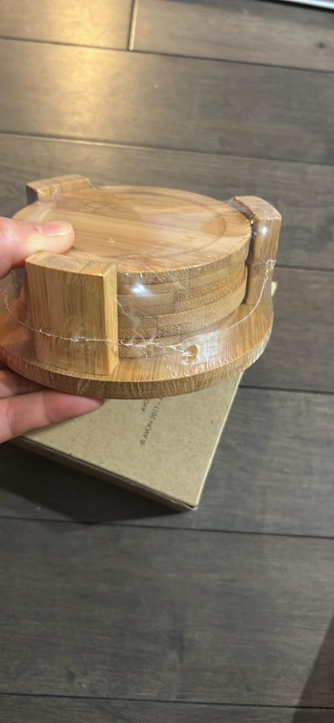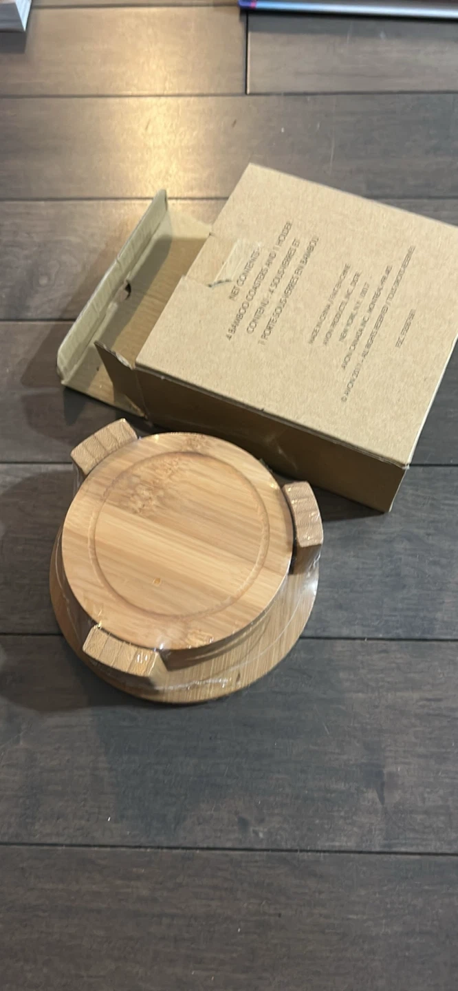 Selling a set of new bamboo coasters with a holder. The set includes 6 coasters and a holder, all made of bamboo and still in the original packaging. Comes with the box