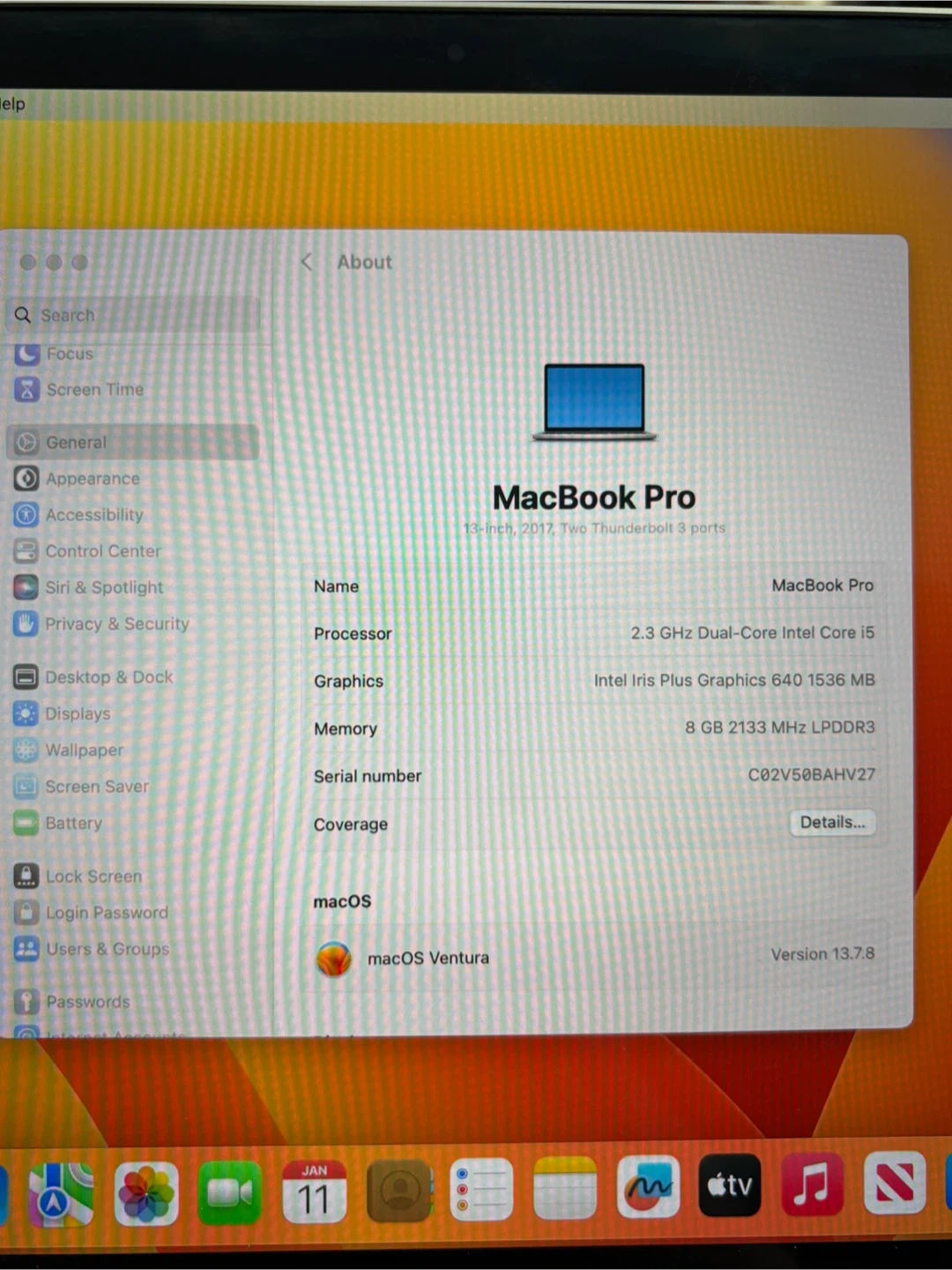 It also has 8 GB 2133 MHz LPDDR3 memory. Runs macOS Ventura Version 13.7.8.