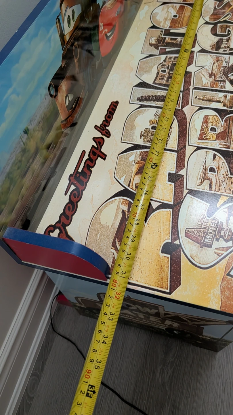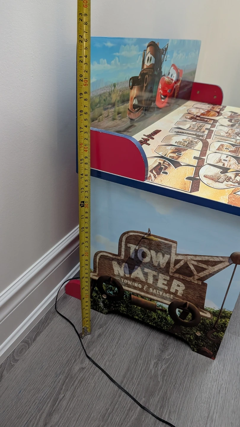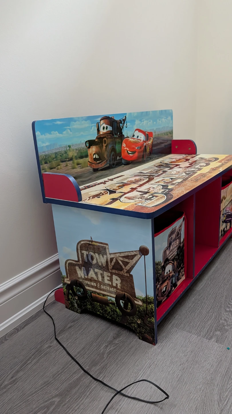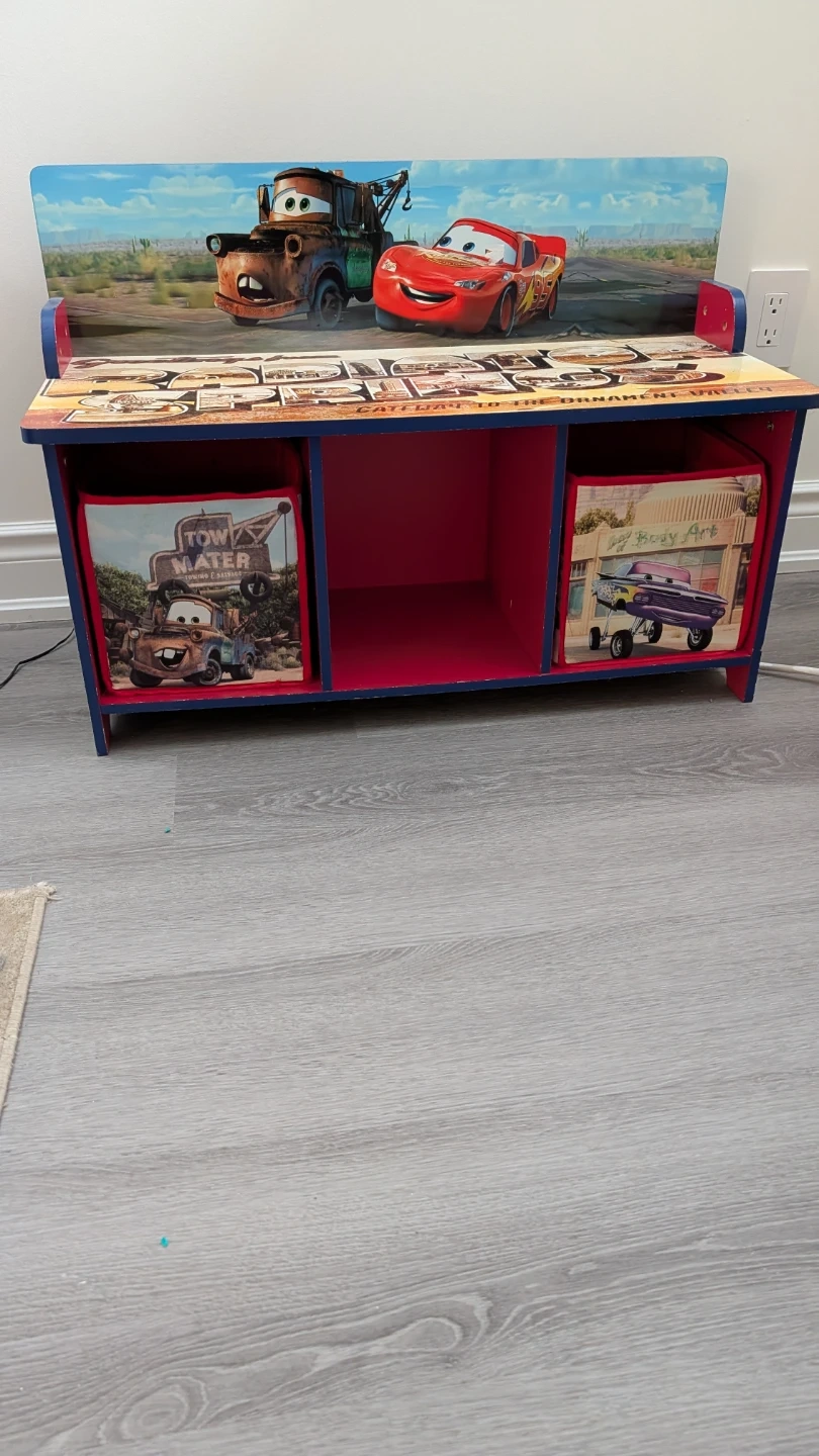 Here's a fun and functional Disney Pixar Cars toy storage bench! It features Lightning McQueen and Mater, with storage cubbies and bins for organizing toys and books. The bench is in good condition and ready to add some character to a playroom or bedroom