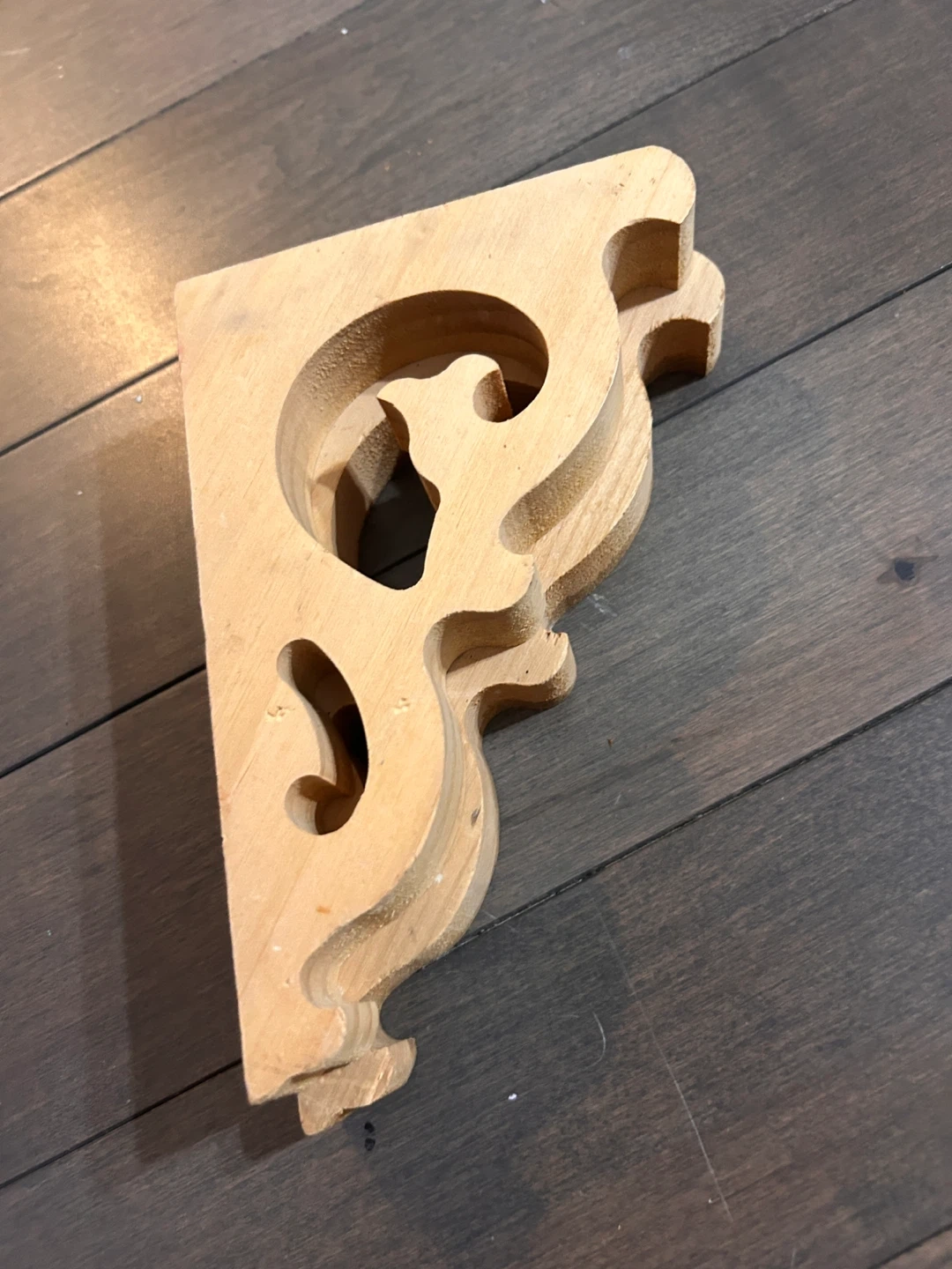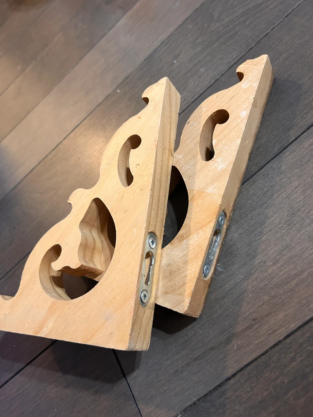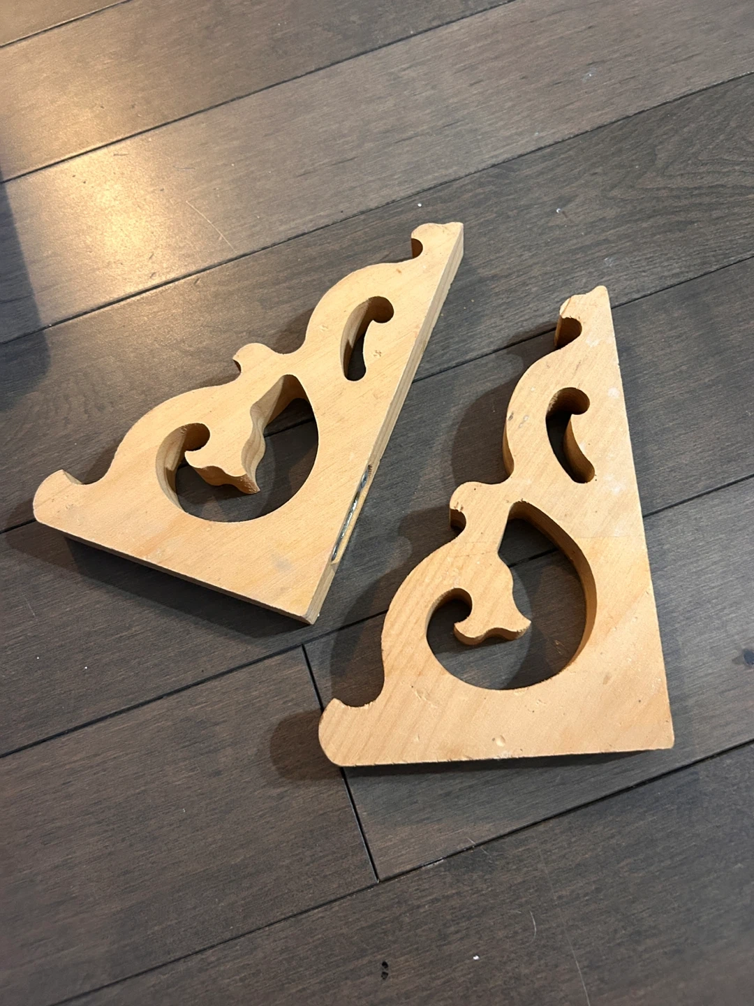 Selling a set of two wooden decorative brackets. They have a unique, ornate design with cutouts and a layered edge. Perfect for adding a touch of elegance to shelves or other DIY projects. They show some signs of wear, but are still in good condition!