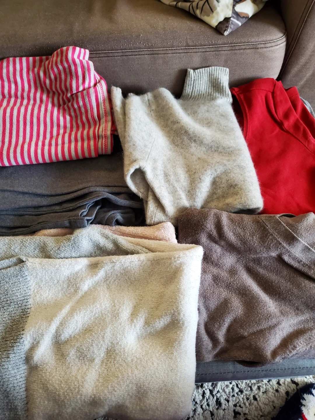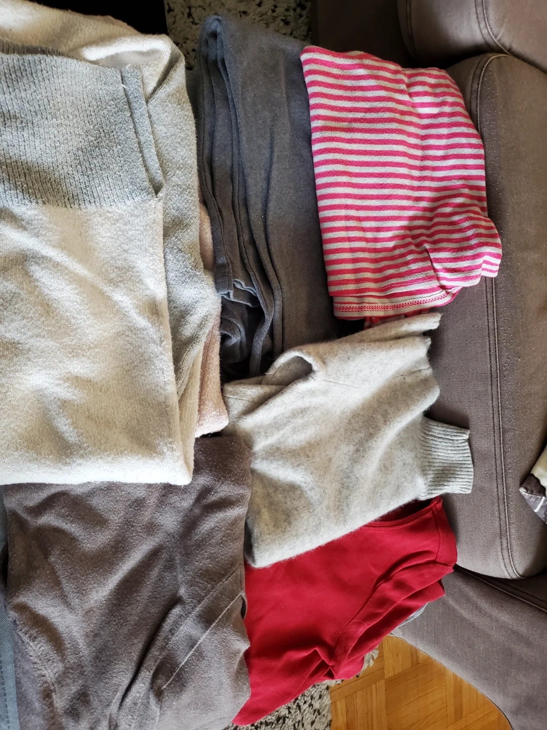 A bundle of gently used sweaters in various colours and sizes. Includes a mix of materials, perfect for layering during the colder months. A great way to refresh your wardrobe with some cozy options!