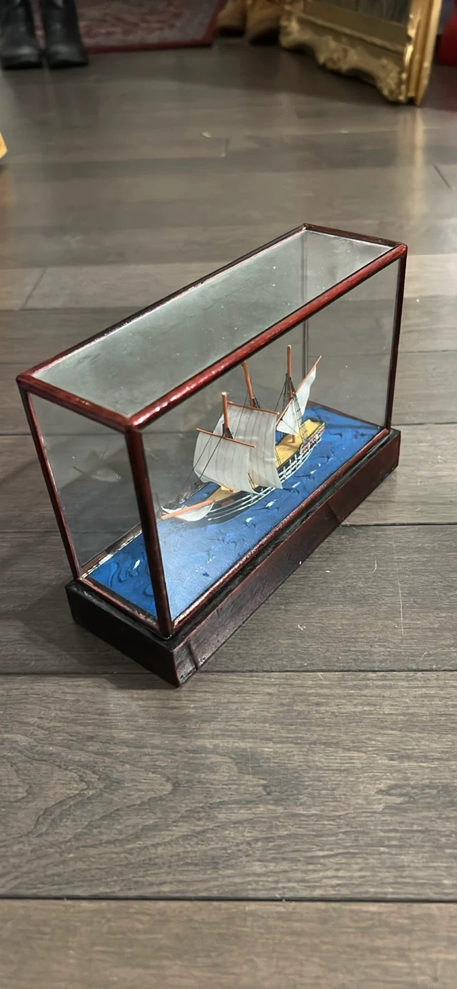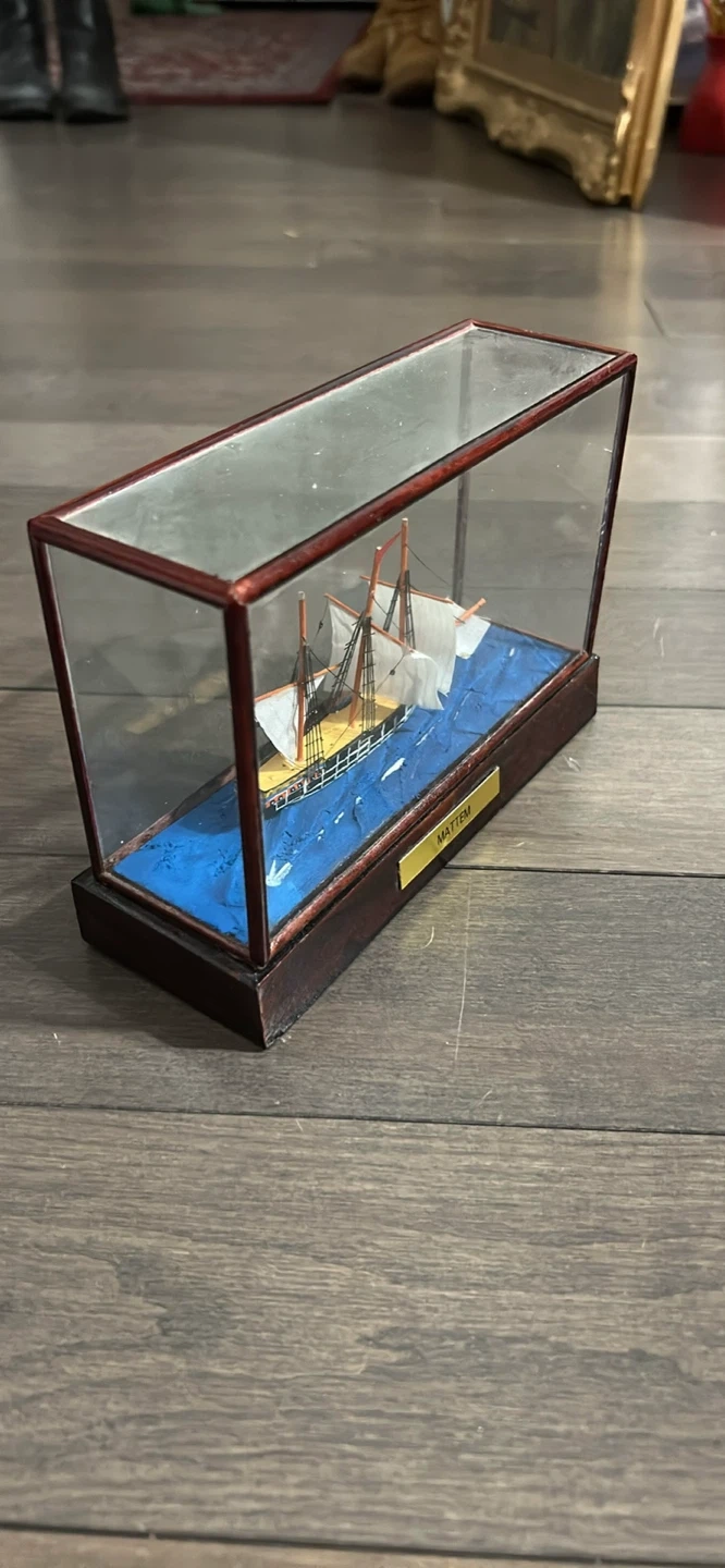 Selling a charming Mayflower ship model displayed inside a glass case. It's a lovely decorative piece for any nautical enthusiast or history buff!