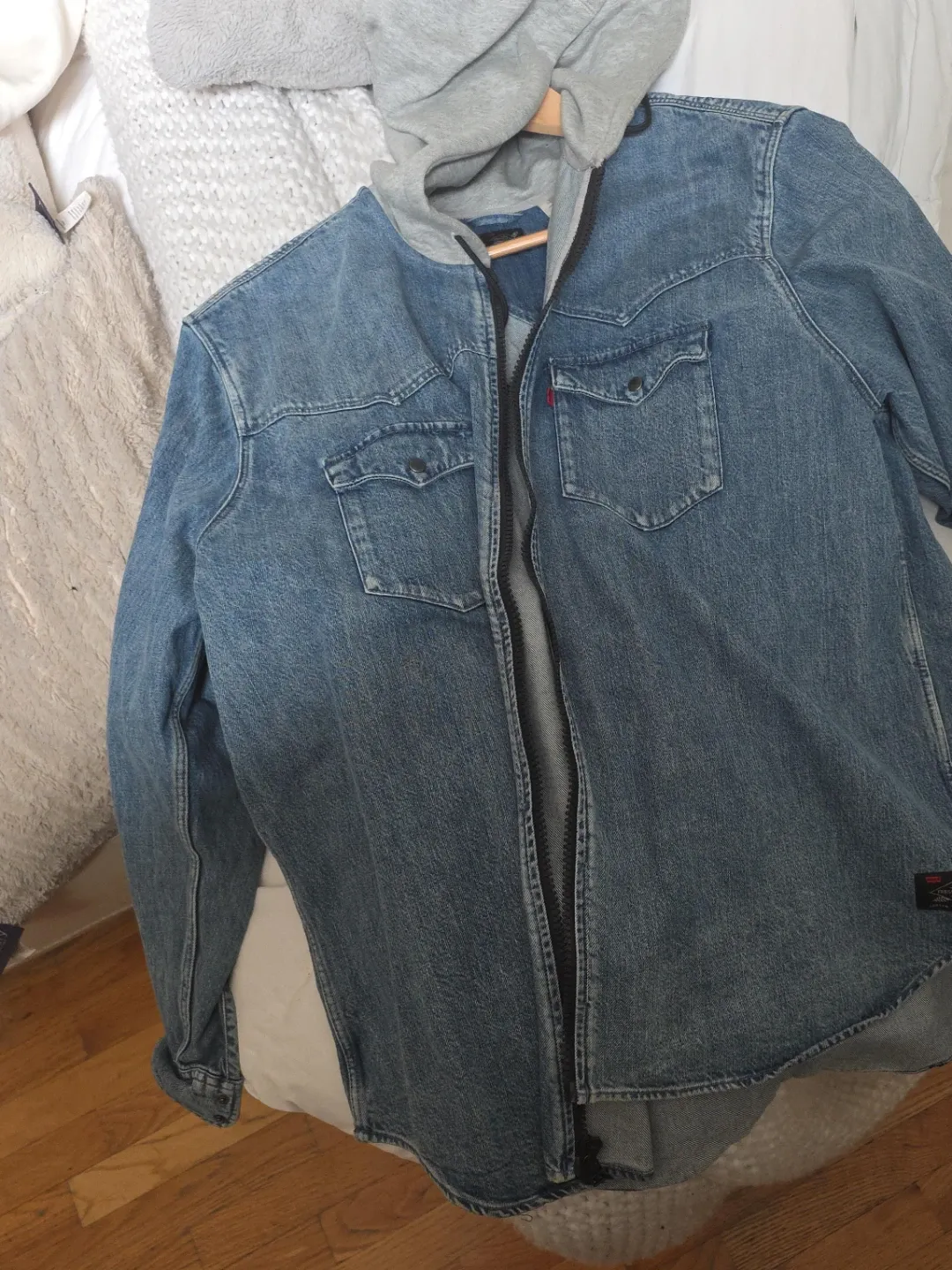 Levi's denim shirt jacket with a gray hood! It's in great condition and ready for a new owner. This jacket is perfect for layering and adding a cool, casual vibe to any outfit