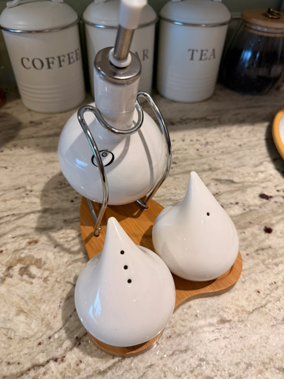 This is a stylish oil and vinegar dispenser set, perfect for adding a touch of elegance to your kitchen or dining table! The set includes a dispenser for oil, along with salt and pepper shakers, all neatly arranged on a bamboo base
