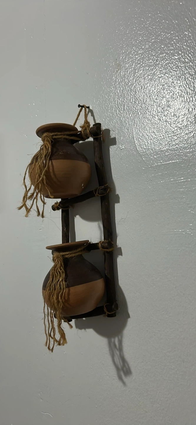 A charming rustic wall decoration featuring two small pots suspended on a wooden frame. It's perfect for adding a touch of country charm to any room. The pots are a two-tone brown and beige colour, and are adorned with twine.