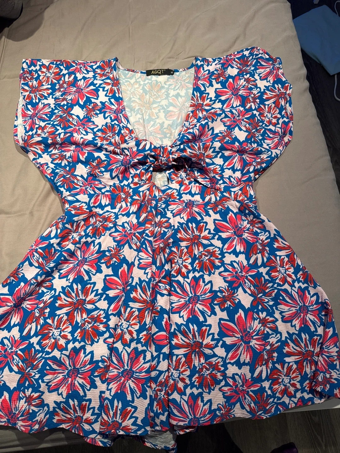 This is a cute AGQT romper with a vibrant floral pattern! It's a size XL and perfect for a sunny day out. The romper features a flattering V-neck and a tie detail at the front. It's in great condition and ready for a new home!