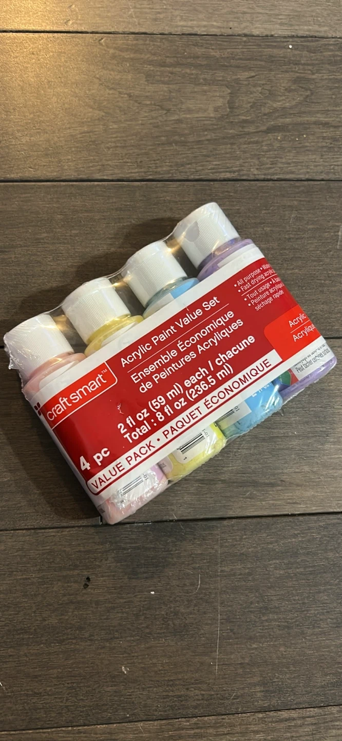 I'm selling a new Craft Smart acrylic paint value set! This set includes 4 pastel colours and each bottle contains 2 fl oz (59 ml) of paint, for a total of 8 fl oz (236.5 ml). Great for all sorts of projects and dries quickly