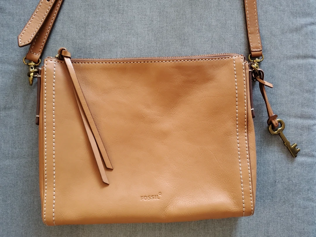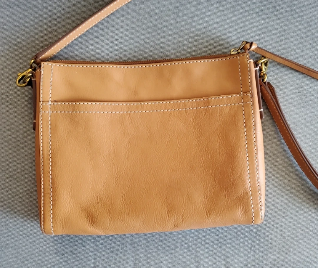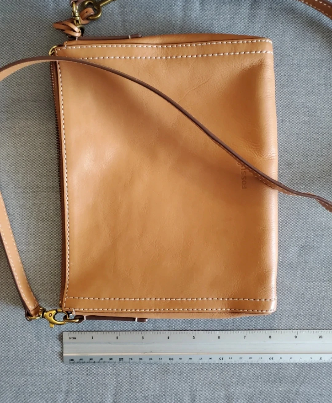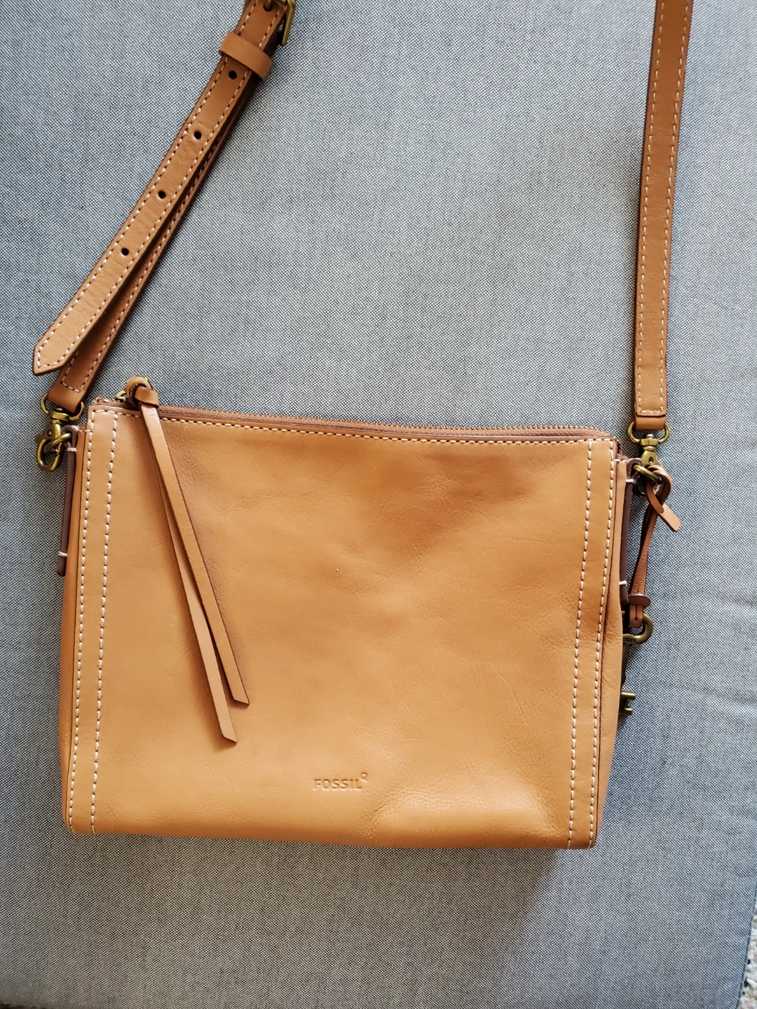 Selling a Fossil leather crossbody bag. It's in good condition and perfect for everyday use. The bag features a zipper closure and an adjustable strap. The interior has a zip pocket and slip pockets for organization. The exterior is a beautiful tan leather.