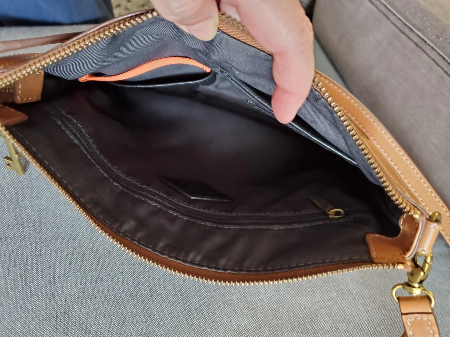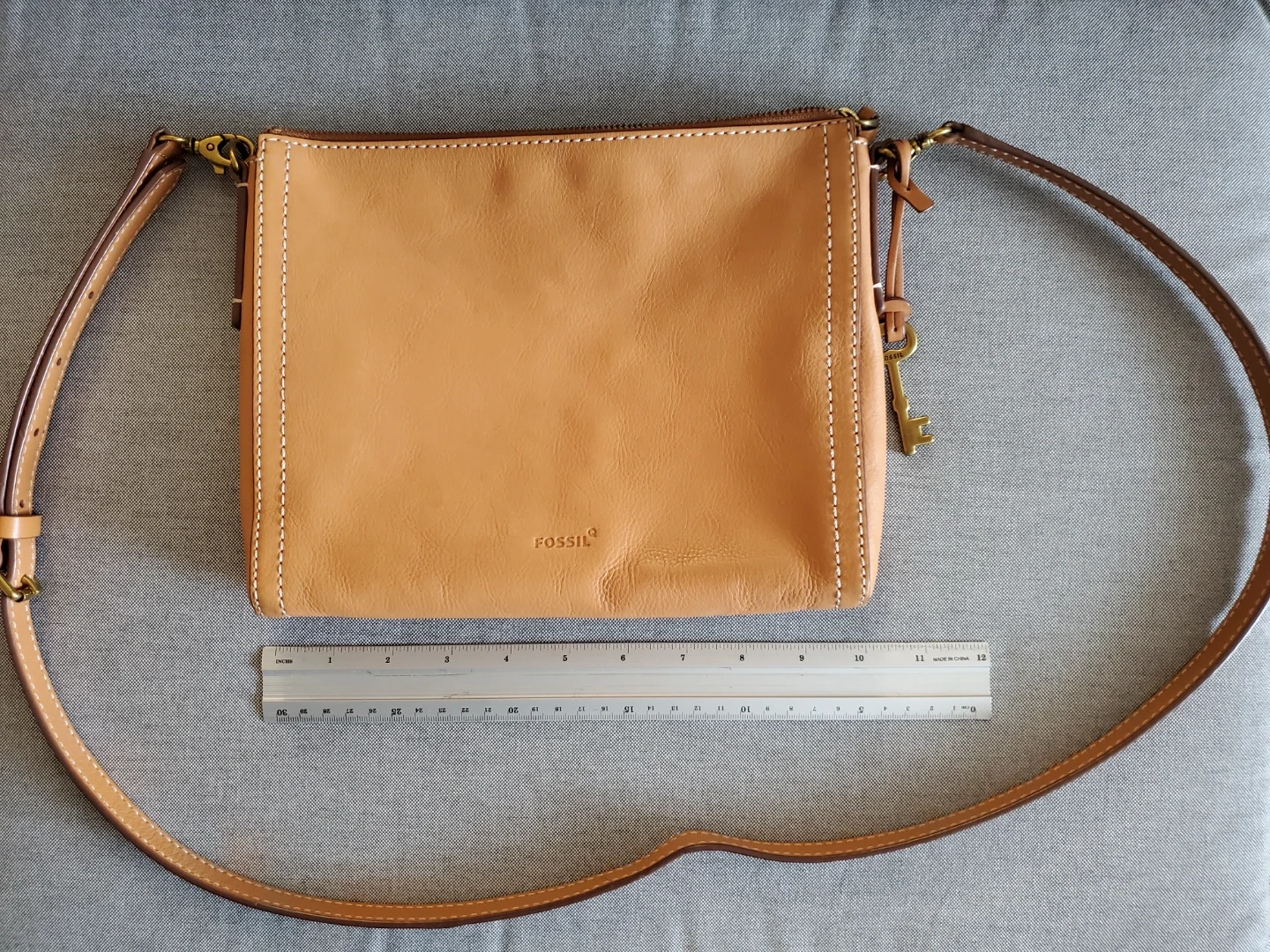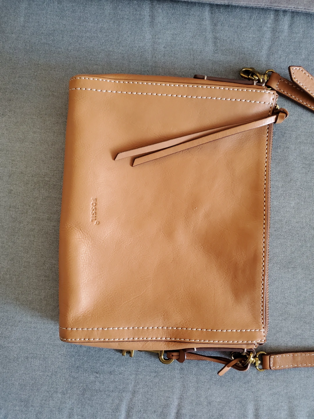 Selling a Fossil leather crossbody bag. It's in good condition and perfect for everyday use. The bag features a zipper closure and an adjustable strap. The interior has a zip pocket and slip pockets for organization. The exterior is a beautiful tan leather.