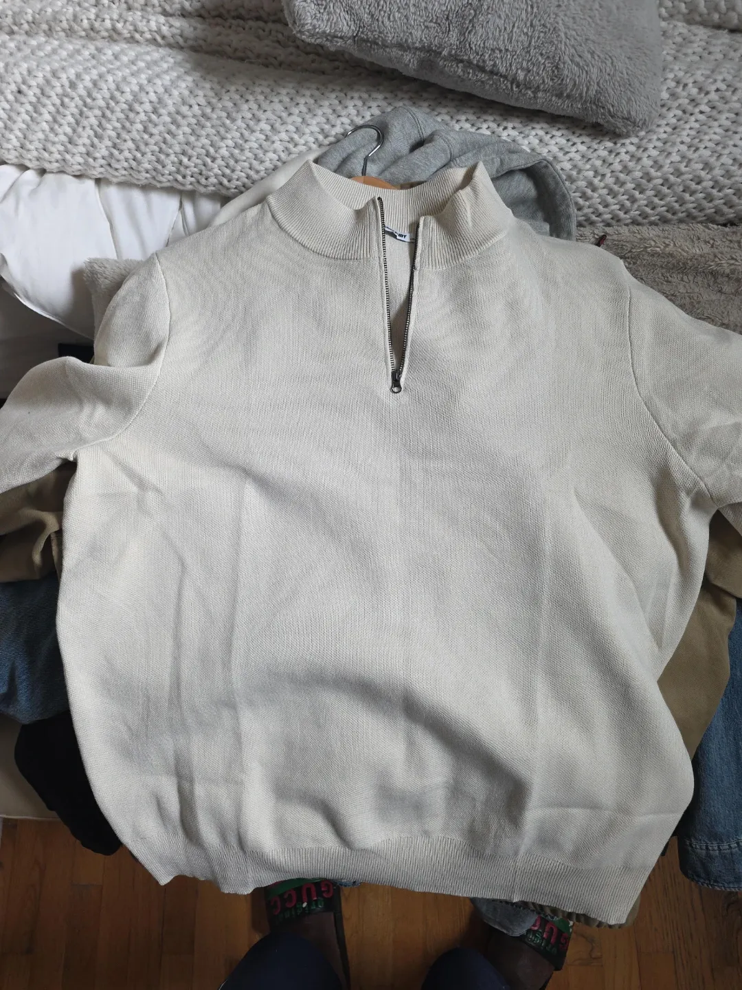 Selling a cream-colored half-zip sweater from Old Navy! It's in great condition and perfect for layering or wearing on its own. The neutral color makes it easy to pair with anything in your wardrobe. This sweater is super comfy and stylish!