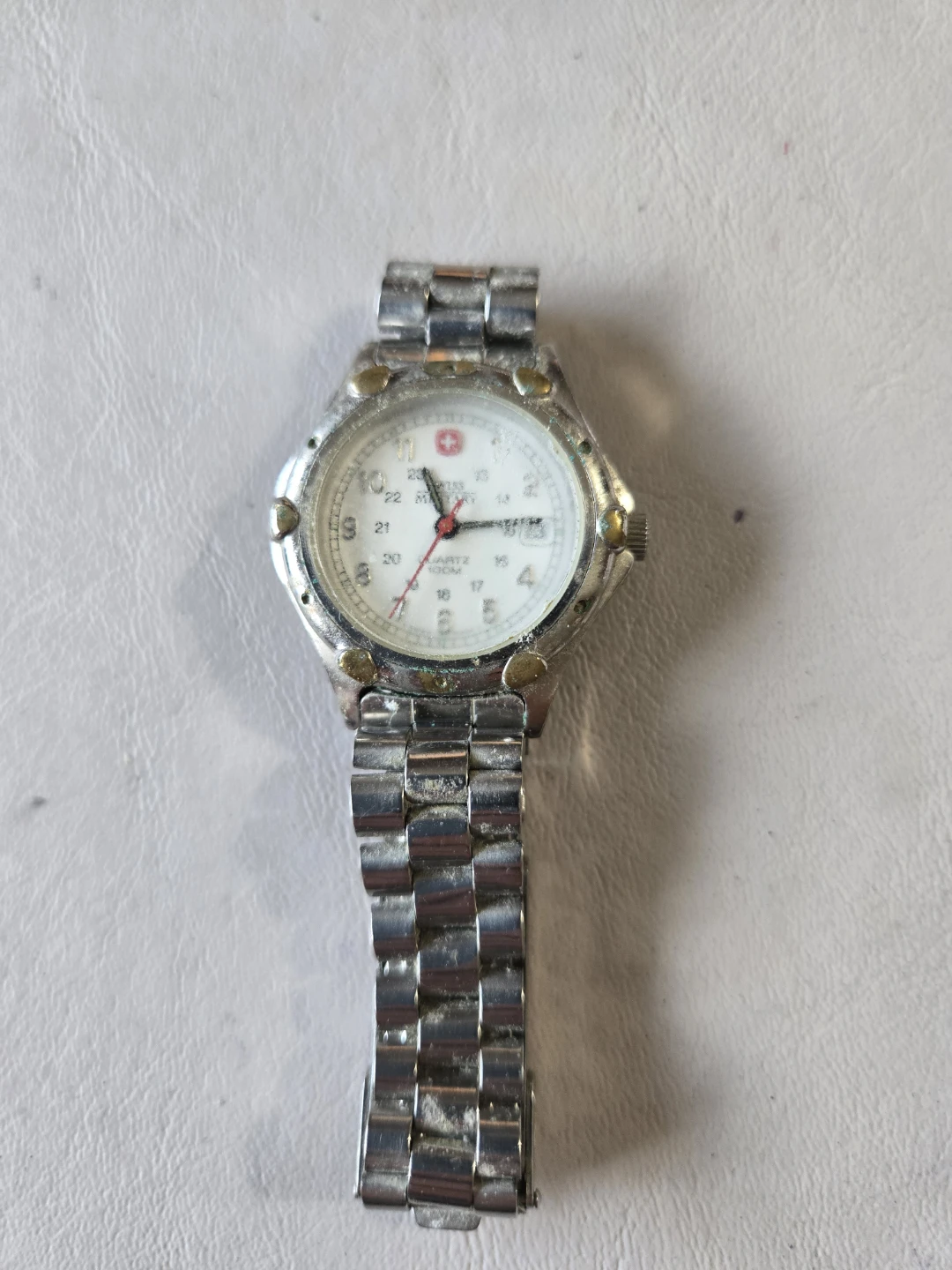 Selling a Swiss Military quartz watch. It has some signs of wear, but still works great. The watch features a stainless steel band and a white dial with 24-hour markings. It's also water-resistant up to 100m.