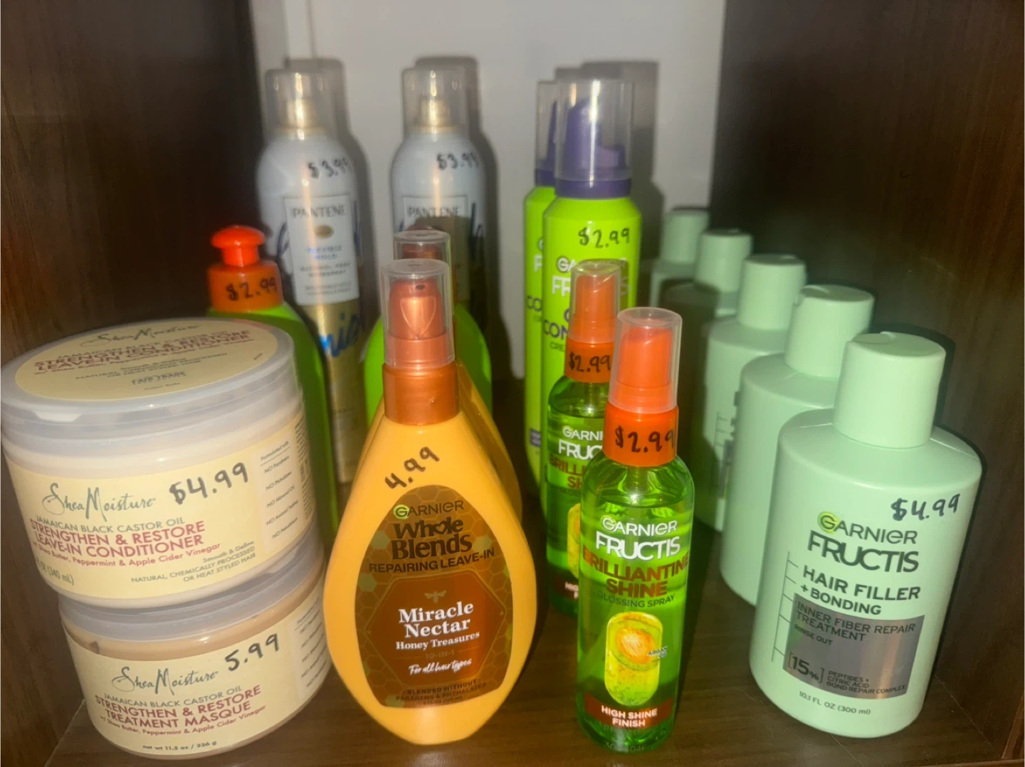 I have a variety of hair products available, including Shea Moisture Strengthen & Restore Leave-In Conditioner and Treatment Masque, Garnier Whole Blends Repairing Leave-In Miracle Nectar, Garnier Fructis Brilliantine Shine Glossing Spray, Garnier Fructis Hair Filler + Bonding, and Pantene hair productos check picture for prices