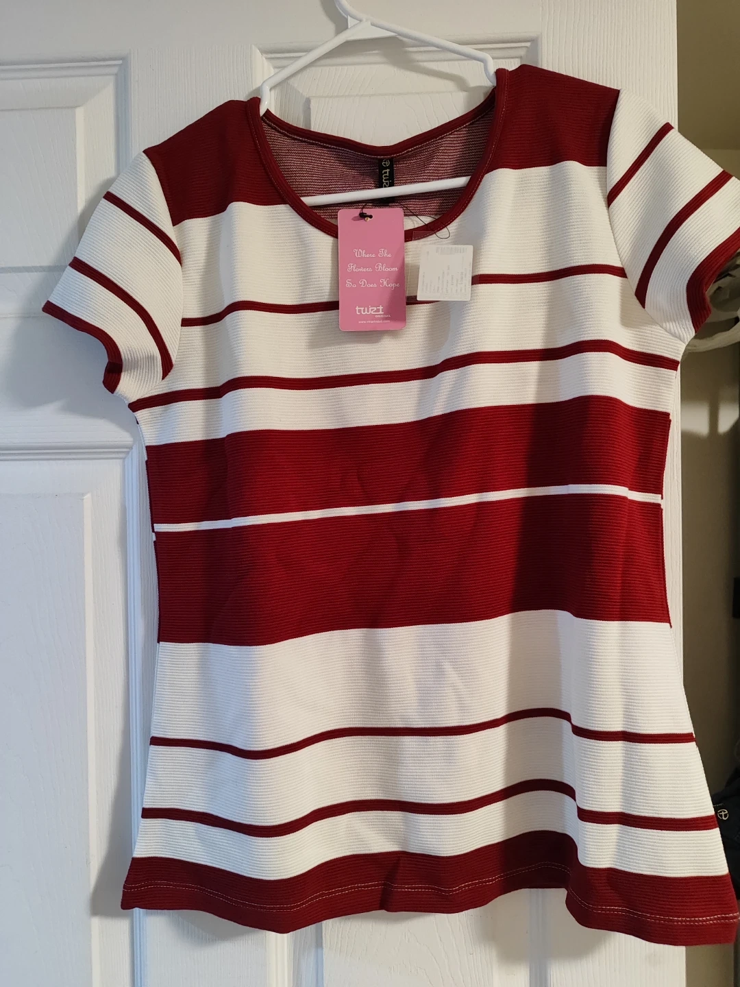 This is a cute Twist brand top with red and white stripes! It's a size medium and features a ribbed texture. Perfect for a casual and stylish look!
