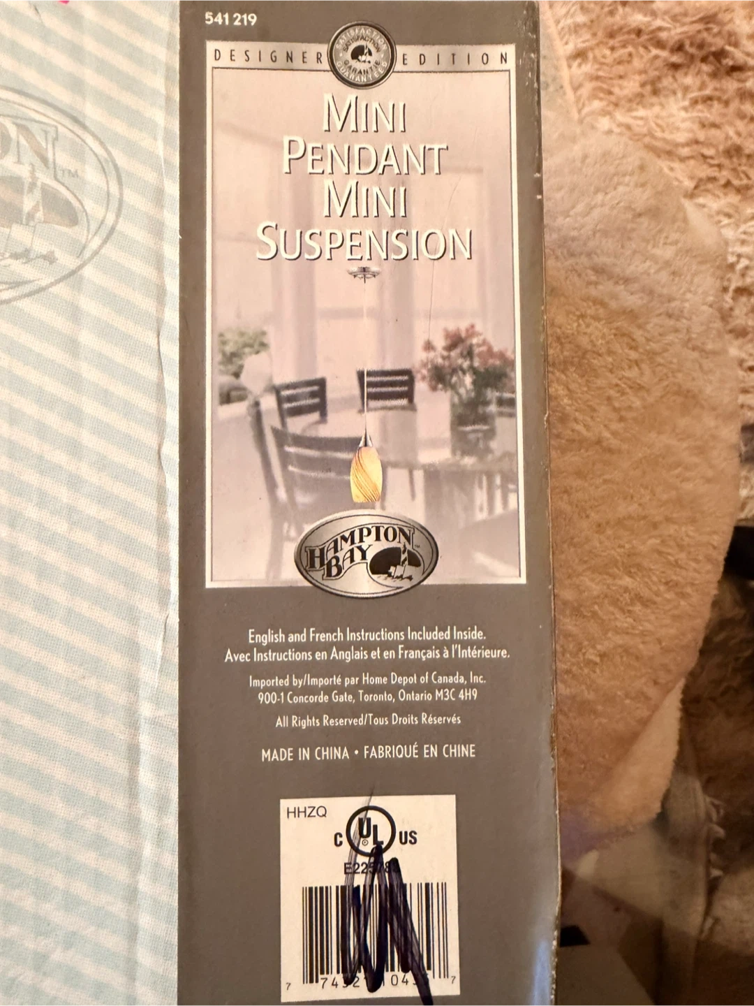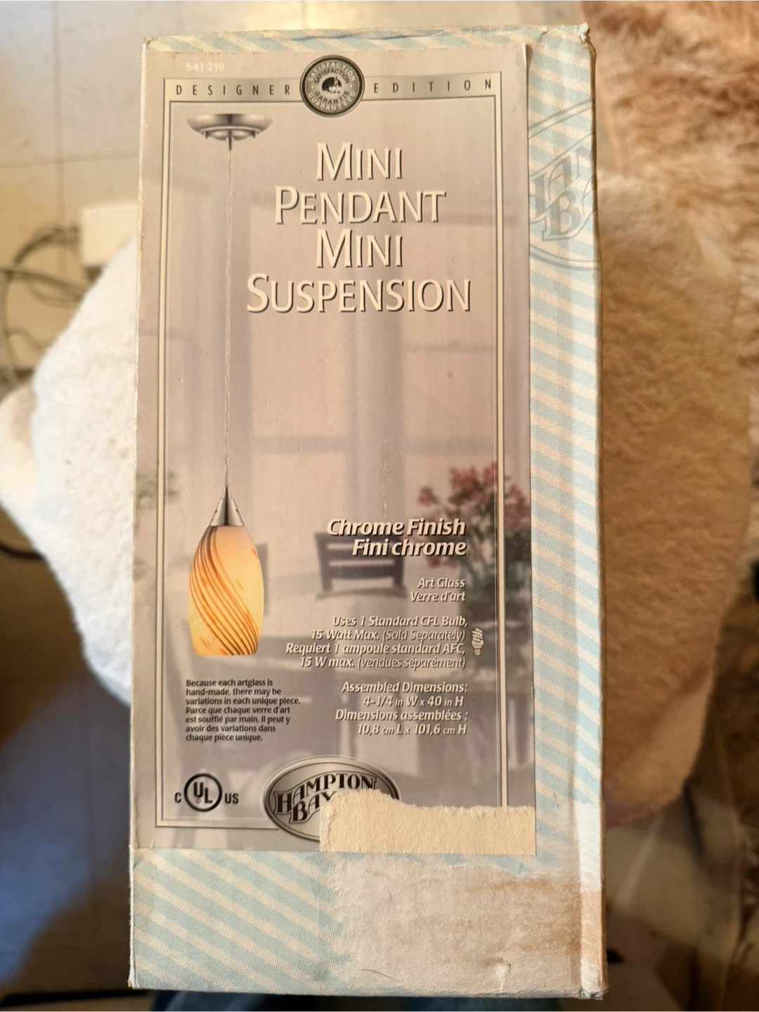 Selling a Hampton Bay Mini Pendant Suspension light! It features a chrome finish and art glass. The assembled dimensions are 4" W x 4" D x 4" H. Includes English and French instructions inside. Perfect for adding a touch of elegance to any room