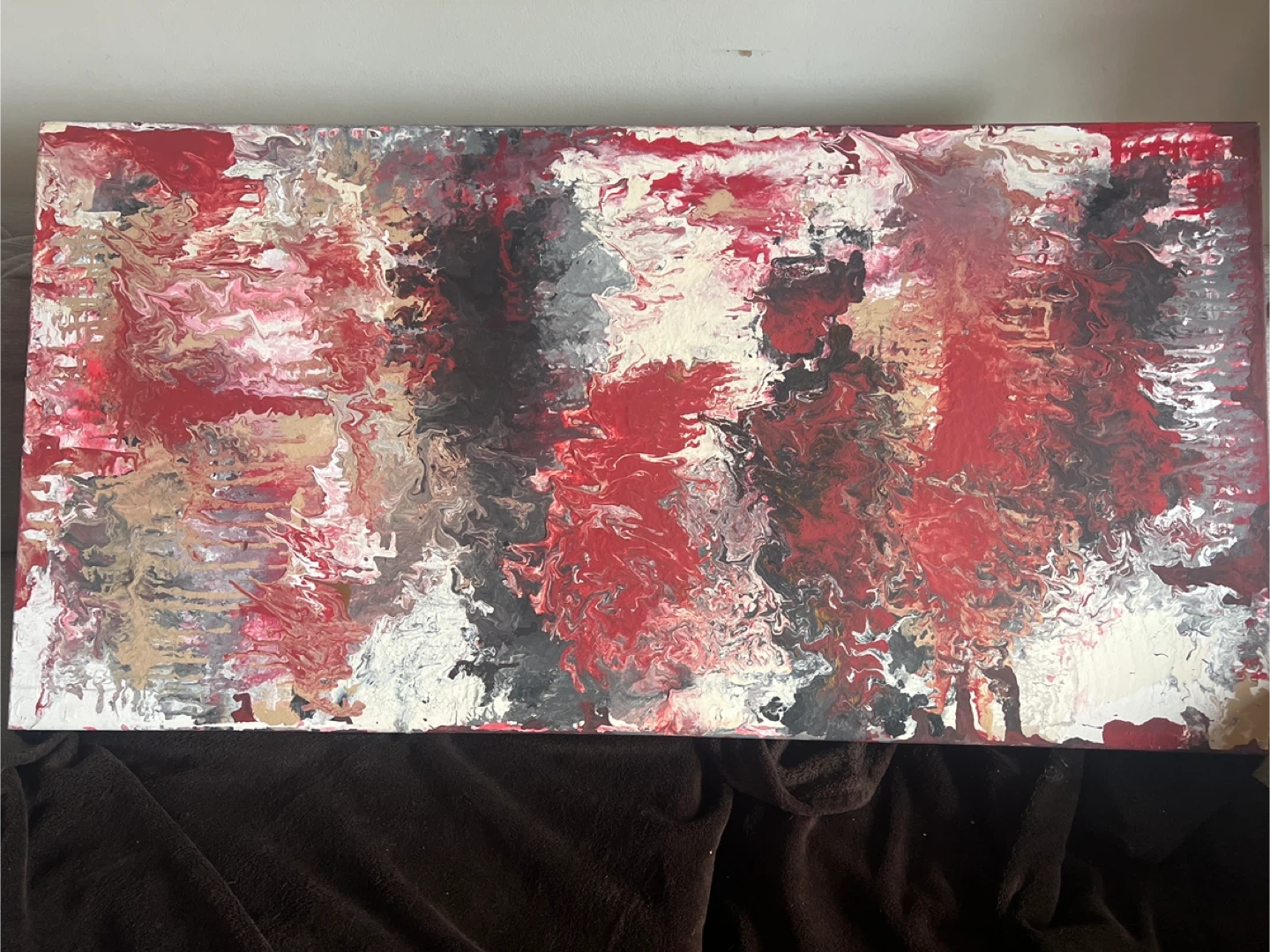 This is an abstract painting featuring a mix of red, black, white, and beige tones.