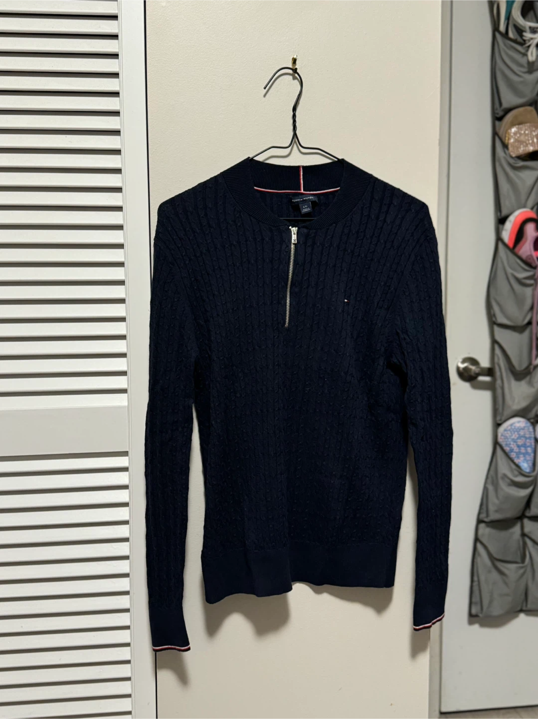 Tommy Hilfiger navy cable knit sweater in size large! Features a quarter-zip design and the classic Tommy Hilfiger logo on the sleeve. Perfect for layering or wearing on its own