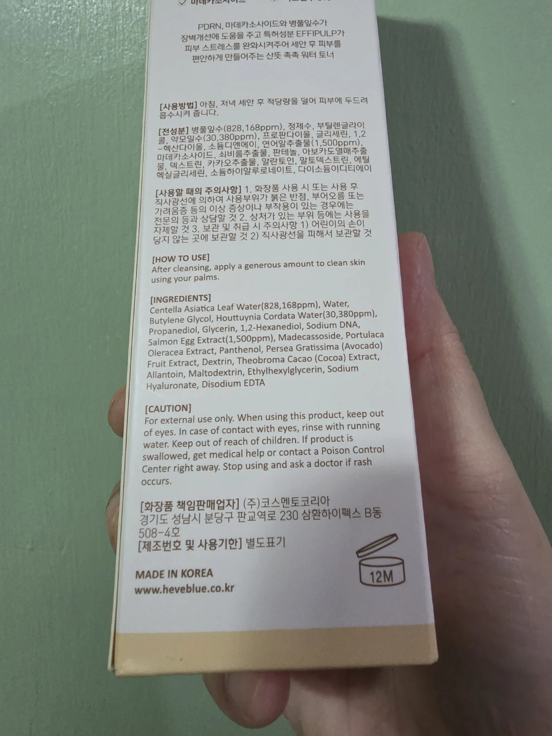 NEW Heveblue Salmon Caring Centella Toner! The toner contains PDRN, Madecassoside, Centella Asiatica, Heartleaf Houttuynia and EFFIPULP. It comes in a 200 ml / 6.76 FL. OZ. size. Expires 10/29/2027.