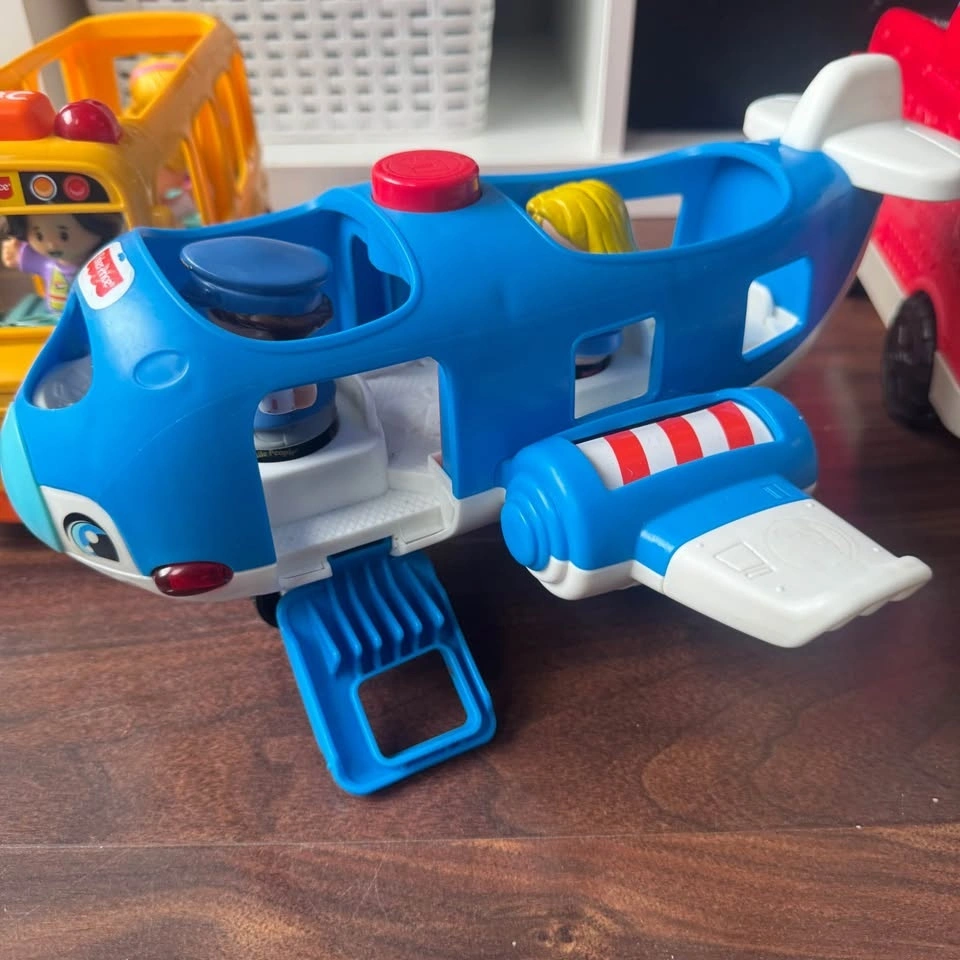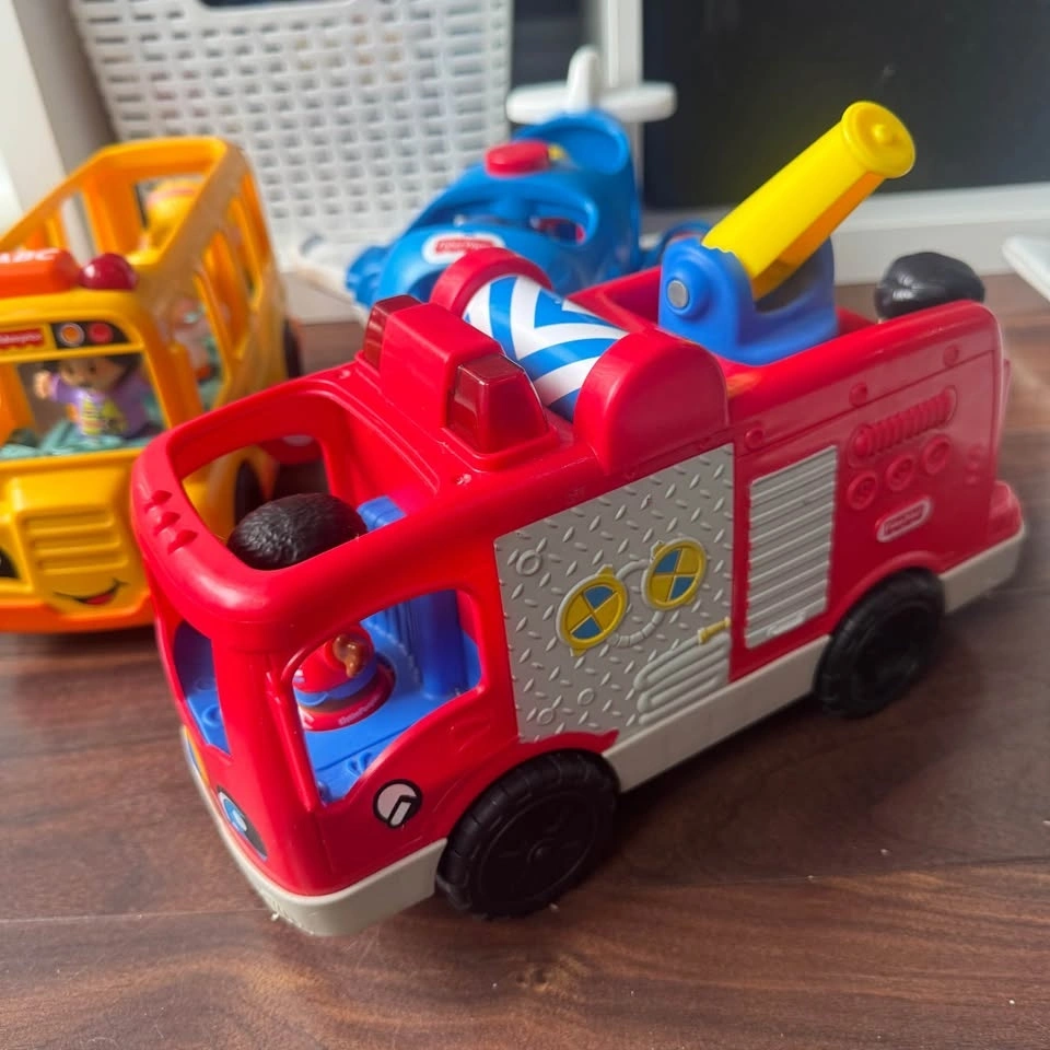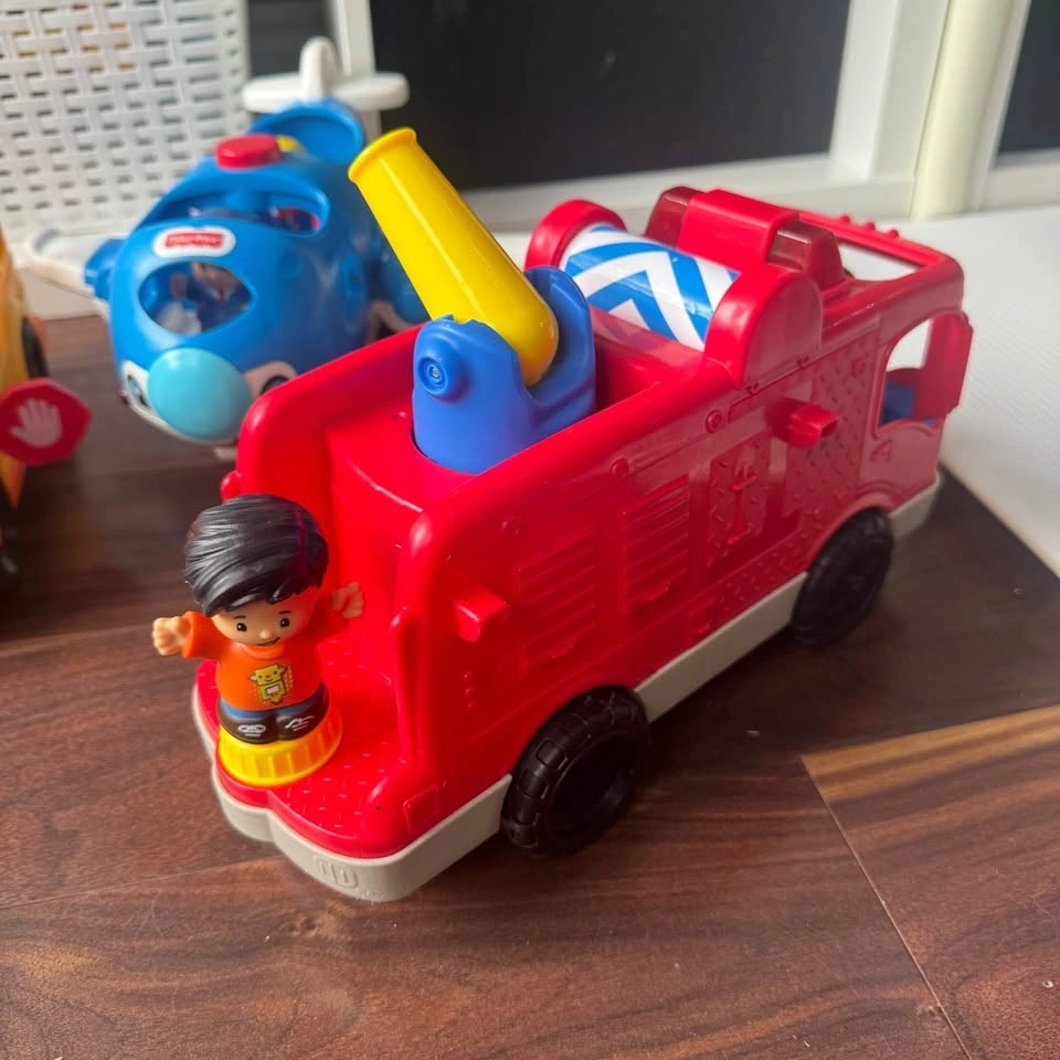 Fun Fisher Price Little People set! Includes a school bus, airplane, and fire truck with figures.